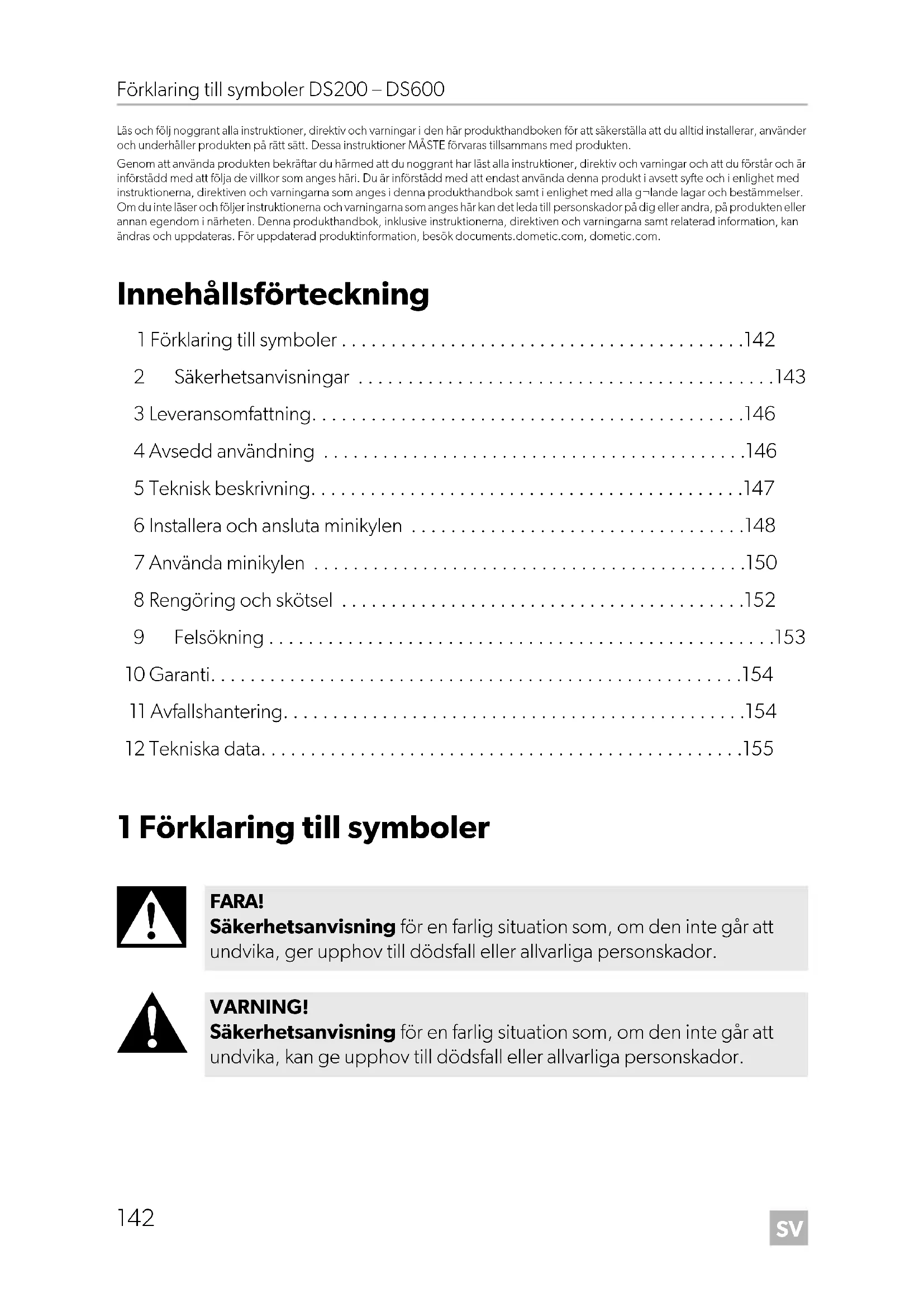FARA! Säkerhetsanvisning för en farlig situation som, om den inte går att undvika, ger upphov till dödsfall eller allvarliga personskador. VARNING! Säkerhetsanvisning för en farlig situation som, om den inte går att undvika, kan ge upphov till dödsfall eller allvarliga personskador. DometicDS200-300-400-600_IOM_4445103315_EMEA16_2020-xx-xx.book Seite 142 Mittwoch, 3. März 2021 11:36 11SV DS200 – DS600 Säkerhetsanvisningar
