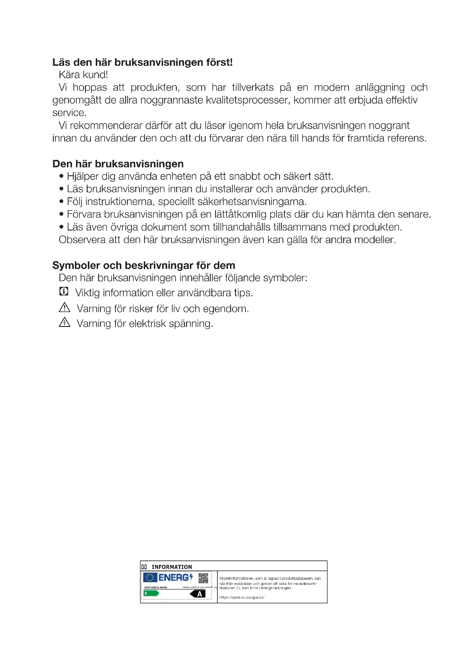 - Läs även övriga dokument som tillhandahålls tillsammans med produkten. Observera att den här bruksanvisningen även kan gälla för andra modeller. Symboler och beskrivningar för dem Den här bruksanvisningen innehåller följande symboler: C Viktig information eller användbara tips. A Varning för risker för liv och egendom. B Varning för elektrisk spänning. INFORMATION Modellinformationen, som är lagrad t produktdatabasen, kan nås från webbsidan och genom att söka för modellindenti-fikationen (*), som finns i energimärkningen.https://eprel.ec.europa.eu/