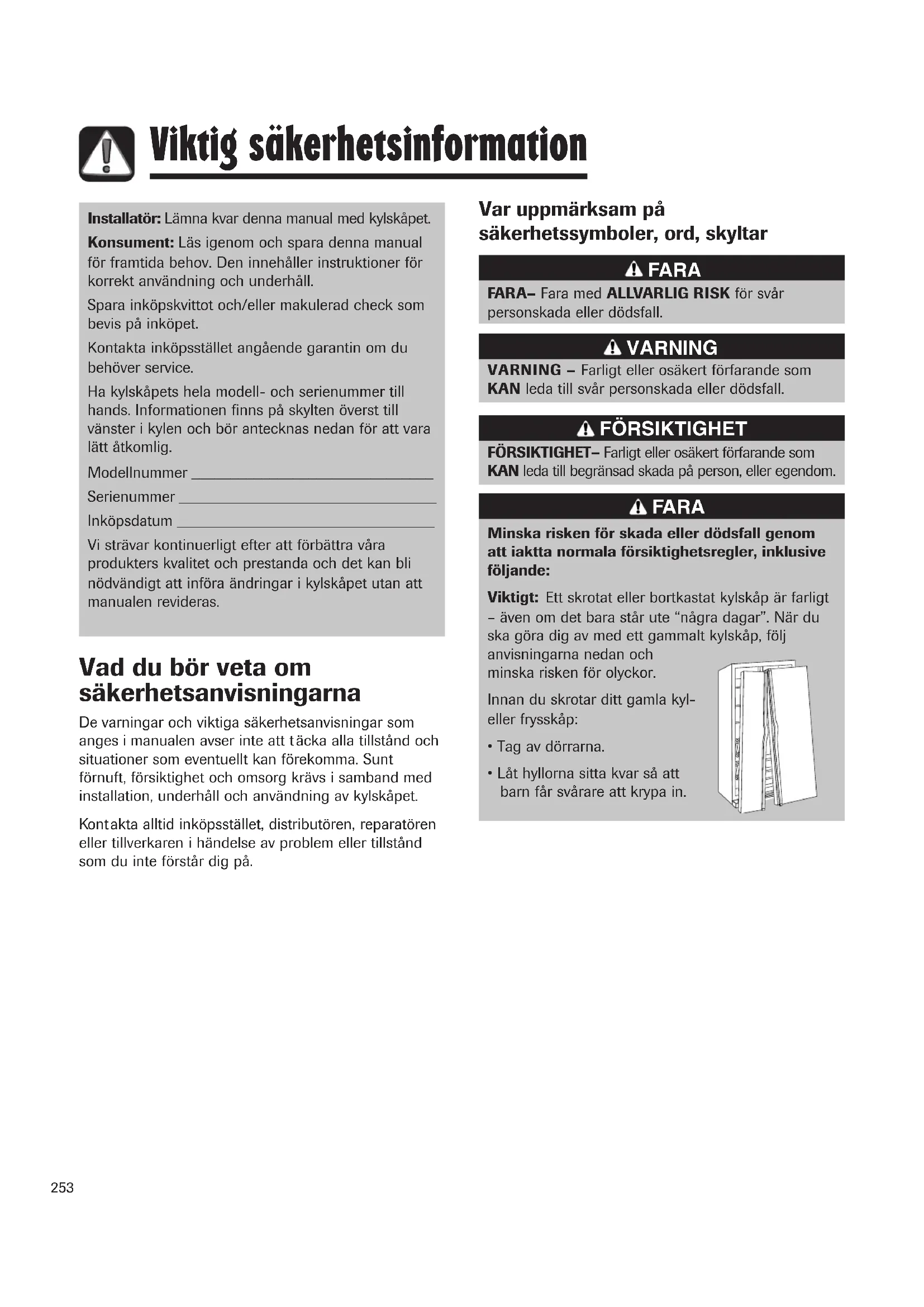 ont akta alltid inköpsstället, distributören, reparatören eller tillverkaren i händelse av problem eller tillstånd som du inte förstår dig på. Installatör: Lämna kvar denna manual med kylskåpet. Konsument: Läs igenom och spara denna manual för framtida behov. Den innehåller instruktioner för korrekt användning och underhåll. Spara inköpskvittot och/eller makulerad check som bevis på inköpet. Kontakta inköpsstället angående garantin om du behöver service. Ha kylskåpets hela modell- och serienummer till hands. Informationen finns på skylten överst till vänster i kylen och bör antecknas nedan för att vara lätt åtkomlig. Modellnummer _______________________________ Serienummer _________________________________ Inköpsdatum _________________________________ Vi strävar kontinuerligt efter att förbättra våra produkters kvalitet och prestanda och det kan bli nödvändigt att införa ändringar i kylskåpet utan att manualen revideras. Minska risken för skada eller dödsfall genom att iaktta normala försiktighetsregler, inklusive följande: Viktigt: Ett skrotat eller bortkastat kylskåp är farligt – även om det bara står ute “några dagar”. När du ska göra dig av med ett gammalt kylskåp, följ anvisningarna nedan och minska risken för olyckor. Innan du skrotar ditt gamla kyl- eller frysskåp: