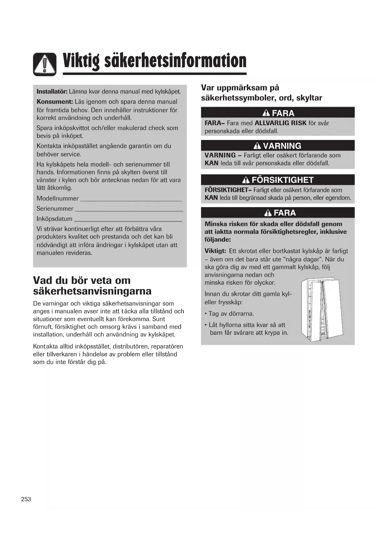 Viktig sakerhetsinformation 253-254