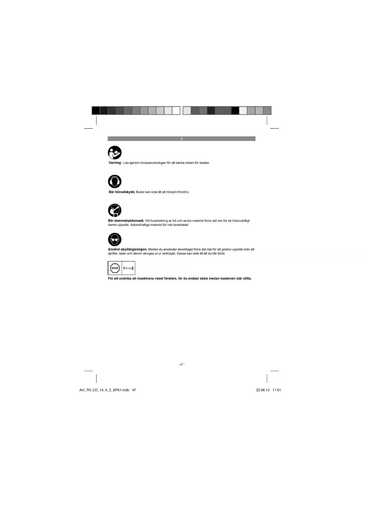 Varning - Läs igenom bruksanvisningen för att sänka risken för skador Bär hörselskydd. Buller kan leda till att hörseln förstörs. Använd skyddsglasögon. Medan du använder elverktyget fi nns det risk för att gnistor uppstår eller att splitter, spån och damm slungas ut ur verktyget. Dessa kan leda till att du blir blind. Bär dammskyddsmask. Vid bearbetning av trä och andra material fi nns det risk för att hälsovådligt damm uppstår. Asbesthaltiga material får inte bearbetas! För att undvika att maskinens växel förstörs, får du endast växla medan maskinen står stilla. Anl_TH_CD_14_4_2_SPK1.indb 47Anl_TH_CD_14_4_2_SPK1.indb 47 22.06.12 11:5122.06.12 11:51S