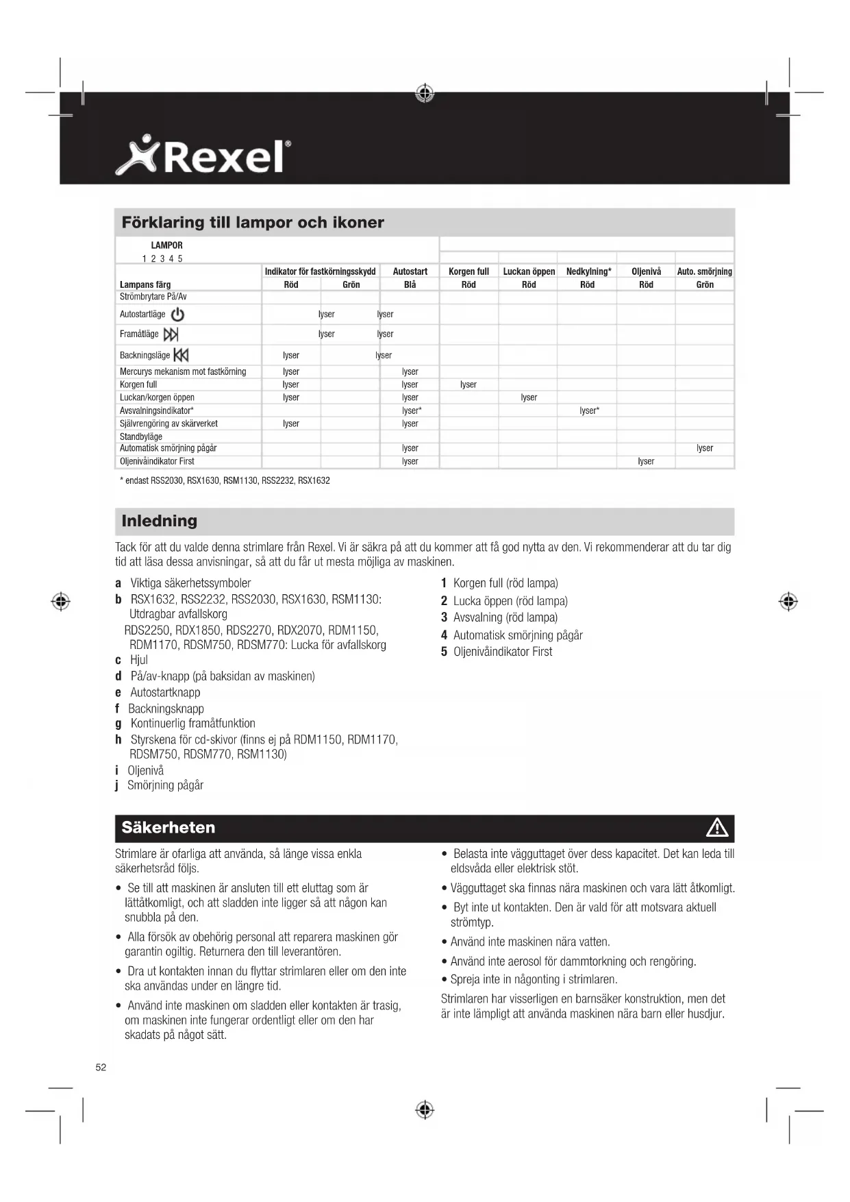 Mercurys mekanism mot fastkörning Mercury-strimlarna river endast pappersbuntar som är inom strimlarens arkkapacitet. Om en strimlare exempelvis har en kapacitet på 22 ark, går det inte att strimla fler ark än så. Sensorer i inmatningsområdet mäter tjockleken på pappersbunten som matas in. Den gröna eller röda lampan anger om bunten kan respektive inte kan rivas. Om den gröna lampan lyser betyder det att arkbunten är inom strimlarens arkkapacitet och kan rivas. Om den röda lampan lyser betyder det att du har matat in för mycket papper. Då måste du ta ut några ark för att bunten ska kunna rivas. Eftersom det inte går att riva fler ark än strimlaren klarar av, blir det aldrig några fastkörningar. På så sätt sparar du tid genom att du inte behöver backa för att rensa fastkörningar, och du slipper det skräp som det ofta blir när man gör det. Exceptionell fastkörning Om papperet mot förmodan skulle fastna, använder du backningsfunktionen för att åtgärda fastkörningen (se under Backningsfunktionen). Växla mellan backningsfunktion och kontinuerlig framåtkörningsfunktion för att rensa fastkörningen. Säkerhetsfunktion vid öppen lucka Om luckan öppnas under rivningen träder en säkerhetsmekanism in som genast stoppar rivningen, och symbolen/indikatorn för öppen lucka på indikatorpanelen lyser rött. Överhettning Om modellerna för små kontor (RSS2030, RSX1630, RSM1130, RSS2232 och RSX1632) används kontinuerligt en längre tid, kan strimlaren överhettas. Om det händer tänds termometersymbolen på indikatorpanelen. När strimlaren är klar att användas igen, slocknar termometersymbolen. Kontrollpanel för strimlaren BackFramåt Autostart Säkerheten Detta betyder att du ska vara försiktig, eftersom långt hår kan trassla in sig i skärverket. Detta betyder att du inte ska stoppa in handen i inmatningsöppningen i skärhuvudet. Detta betyder att du ska vara försiktig med slipsar och andra lösa klädesplagg som kan trassla in sig i skärhuvudet. Detta betyder att du ska hålla barn borta från strimlaren. Detta betyder att du ska vara försiktig med hängande smycken som kan trassla in sig i skärhuvudet. Detta betyder att luckan är öppen. Detta betyder att avfallskorgen är full. Detta betyder att inga aerosoler ska användas. Detta betyder att maskinen är i avsvalningsläge. Endast RSM1130, RDM1150 och RDSM750. Detta betyder att du inte ska riva cd-skivor. Detta betyder att du inte ska riva kreditkort. Detta betyder att du inte ska riva häftklamrar. Detta betyder att du inte ska riva gem. Detta avser oljenivån. Detta betyder att smörjning pågår. Innan du börjar Strimlaren är avsedd att smörja skärverket automatiskt, alltefter behov, för att säkerställa att produkten fortsätter att fungera på högsta nivå och för att förlänga produktens liv. Innan du slår på maskinen för första gången ska du öppna locket till oljetanken överst på strimlaren (j) och tömma i flaskan med 60 ml strimlarolja som följer med som standard. Det är tillräckligt för att strimlaren ska starta första gången och kunna strimla kontinuerligt i ca en timme, innan tanken måste fyllas på igen. Håll ner autostartknappen (f) i 5 sekunder för att starta pumpen och fylla systemet. Detta är bara nödvändigt den allra första gången strimlaren används. När oljepåfyllningsindikatorn tänds , öppnar du locket till oljetanken (j) och fyller på tanken med en flaska Rexel strimlarolja av standardstorlek (1760049). Den automatiska smörjningen tar ca 2 sekunder. Du kan höra fördelningspumpen gå. Automatisk smörjning sker efter 15 minuters rivning.54 Backningsfunktionen 1 Om du vill slå om rivningsriktningen under rivning av ett dokument finns det en backningsknapp (f) som du kan använda. 2 Om du trycker på backningsknappen byter knivarna riktning, så att du kan ta ut dokumentet som håller på att rivas. Indikatorn för fastkörningsskydd börjar lysa rött. 3 Backningen pågår bara medan knappen hålls nere. När backningsknappen släpps upp går strimlaren tillbaka till standbyläge. 4 För att gå tillbaka till autostartläge trycker du på autostartknappen (e). Rivning av cd-skivor och kreditkort Modellerna RSM1130, RDM1150, RDM1170, RDSM750 och RDSM770 kan inte riva cd-skivor eller kreditkort, och detta avsnitt är därför inte relevant för de tre modellerna. Samtliga andra Mercury-modeller kan riva cd-skivor och kreditkort enligt följande: 1 Det finns en separat cd-bricka för uppsamling av skärvorna från cd-skivor. Se till att den sitter rätt monterad på stödramen för avfallssäckar eller den inbyggda avfallskorgen (modeller för små kontor) innan du river cd-skivor och kreditkort. Skärvor av cd-skivor och kreditkort ska slängas separat från papper. 2 Dra upp styrskenan för cd-skivor (h) mitt i inmatningsområdet och knäpp fast den över inmatningsspringan. 3 För rivning av kreditkort ställer du strimlaren i autostartläge och för in kortet i linje med pilen i inmatningsområdet. Riv bara ett kreditkort åt gången. 4 För rivning av cd-skivor för du ut styrskenans sidor, ställer strimlaren i autostartläge och för in cd-skivan i mitten av cd-springan. Riv bara en cd-skiva åt gången. 5 Töm brickan för cd-avfall efter 8 kreditkort eller cd- skivor, så att du inte riskerar att få sådant avfall i återvinningspapperet. Ta ut cd-brickan innan du börjar riva papper. Användning 1 När du har packat upp produkten drar du ut avfallskorgen eller ramen för avfallssäck (alltefter modell) och tar ut brickan för cd-skärvor, som sitter ovanpå ramen i modellerna för medelstora kontor och ovanpå avfallskorgen i modellerna för små kontor. Brickan kan förvaras på de därför avsedda krokarna på baksidan av maskinen (i). Den används vid rivning av cd-skivor eller kreditkort så att det avfallet inte blandas med återvinningspapperet (gäller inte modellerna RSM1130, RDM1150, RDM1170, RDSM750 och RDSM