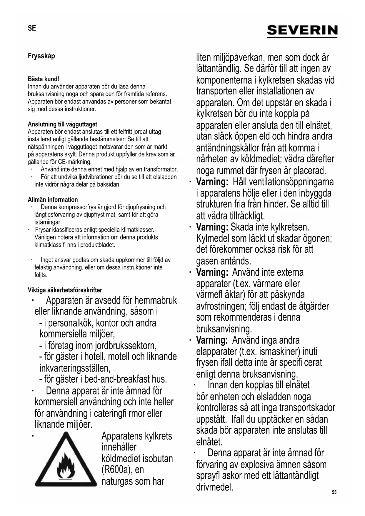 Apparatens kylkrets innehåller köldmediet isobutan (R600a), en naturgas som har liten miljöpåverkan, men som dock är lättantändlig. Se därför till att ingen av komponenterna i kylkretsen skadas vid transporten eller installationen av apparaten. Om det uppstår en skada i kylkretsen bör du inte koppla på apparaten eller ansluta den till elnätet, utan släck öppen eld och hindra andra antändningskällor från att komma i närheten av köldmediet; vädra därefter noga rummet där frysen är placerad. ∙ Varning: Håll ventilationsöppningarna i apparatens hölje eller i den inbyggda strukturen fria från hinder. Se alltid till att vädra tillräckligt. ∙ Varning: Skada inte kylkretsen. Kylmedel som läckt ut skadar ögonen; det förekommer också risk för att gasen antänds. ∙ Varning: Använd inte externa apparater (t.ex. värmare eller värmefl äktar) för att påskynda avfrostningen; följ endast de åtgärder som rekommenderas i denna bruksanvisning. ∙ Varning: Använd inga andra elapparater (t.ex. ismaskiner) inuti frysen ifall detta inte är specifi cerat enligt denna bruksanvisning. ∙ Innan den kopplas till elnätet bör enheten och elsladden noga kontrolleras så att inga transportskador uppstått. Ifall du upptäcker en sådan skada bör apparaten inte anslutas till elnätet. ∙ Denna apparat är inte ämnad för förvaring av explosiva ämnen såsom sprayfl askor med ett lättantändligt drivmedel. SE56 ∙ Om enheten är såld, överlåten till tredje part eller lämnad till en lämplig återvinningsstation bör man observera att apparaten innehåller blåsmedlet ’cyclopentan’ samt frysmediet R600a. Mer information om korrekt återvinning hittar du i avsnittet Bortskaffning. ∙ Följ säkerhetsföreskrifterna och undvik risker genom att låta behörig servicepersonal utföra reparationer eller ändringar beträffande denna apparat, inklusive byte av elsladd. ∙ Denna apparat kan endast användas av barn (minst 8 år gamla) och av personer som har minskad fysisk rörelseförmåga, reducerat sinnes- eller mentaltillstånd, eller som har bristfällig erfarenhet och kunskap, förutsatt att dessa personer är under uppsyn eller har fått tillräckliga instruktioner beträffande apparatens användning och vet vilka risker och säkerhetsåtgärder som användningen innefattar. ∙ Barn bör inte tillåtas leka med apparaten. ∙ Barn bör inte tillåtas rengöra eller underhålla apparaten utan övervakning. ∙ För alldaglig rengöring rekommenderar vi att varmt vatten och ett milt rengöringsmedel används. Alla tillbehör bör tvättas separat i tvålvatten. Tvätta dem inte i diskmaskinen! ∙ För att undvika risken för personlig skada eller skador på frysen, bör frysen endast transporteras i dess originalemballage. För uppackning och installation krävs 2 personer. ∙ Varning: Håll barn på avstånd från apparatens förpackningsmaterial eftersom fara eventuellt kan uppstå. Det fi nns t.ex. risk för kvävning. ∙ Isen som du avlägsnar ur enheten vid avfrostningen lämpar sig inte för mänsklig konsumtion. ∙ Kontrollera regelbundet att elsladden inte blivit skadad. Om sladden har skadats får apparaten inte längre användas. ∙ På grund av brandrisken bör du inte placera elektriska apparater ovanpå frysen. Placera inte behållare innehållande vätska ovanpå enheten. Härigenom undviker du eventuellt läckage eller att läckande vätska skadar den elektriska isoleringen. ∙ Denna enhet är endast ämnad för förvaring av livsmedel. ∙ Ämnen som innehåller alkohol bör bevaras i väl tillslutna behållare och placeras i upprätt position. ∙ Förvara inte glasfl askor innehållande kolsyrade eller andra frysbara vätskor i frysen: sådana fl askor kan spricka under frysprocessen. ∙ Undvik risken för matförgiftning genom att inte äta mat som förvarats för länge. Upptinad mat får inte frysas på nytt. ∙ Luta dig inte mot eller lägg oskälig vikt på hyllorna, förvaringsbackarna, dörren etc. ∙ Skydda alltid frysens insida från öppen eld och andra antändningskällor. ∙ Dra alltid stickproppen ur vägguttaget - om apparaten skulle uppvisa fel och, - före avfrostning, samt - före rengöring. - innan service eller reparation påbörjas. ∙ Tag stickproppen ur vägguttaget genom att dra i stickproppen, aldrig i sladden. ∙ Om inte enheten används under en lång tid rekommenderar vi att dörren hålls öppen. ∙ Vi förbehåller oss rätten att introducera tekniska modifi kationer. Delar