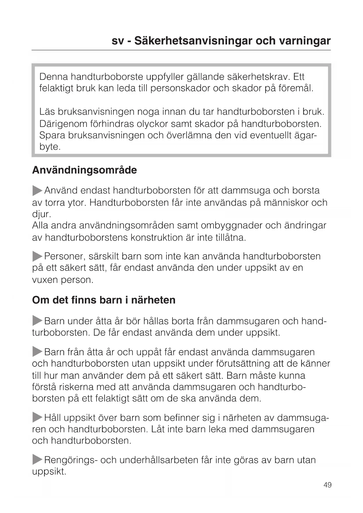 Barn från åtta år och uppåt får endast använda dammsugaren och handturboborsten utan uppsikt under förutsättning att de känner till hur man använder dem på ett säkert sätt. Barn måste kunna förstå riskerna med att använda dammsugaren och handturbo- borsten på ett felaktigt sätt om de ska använda dem.