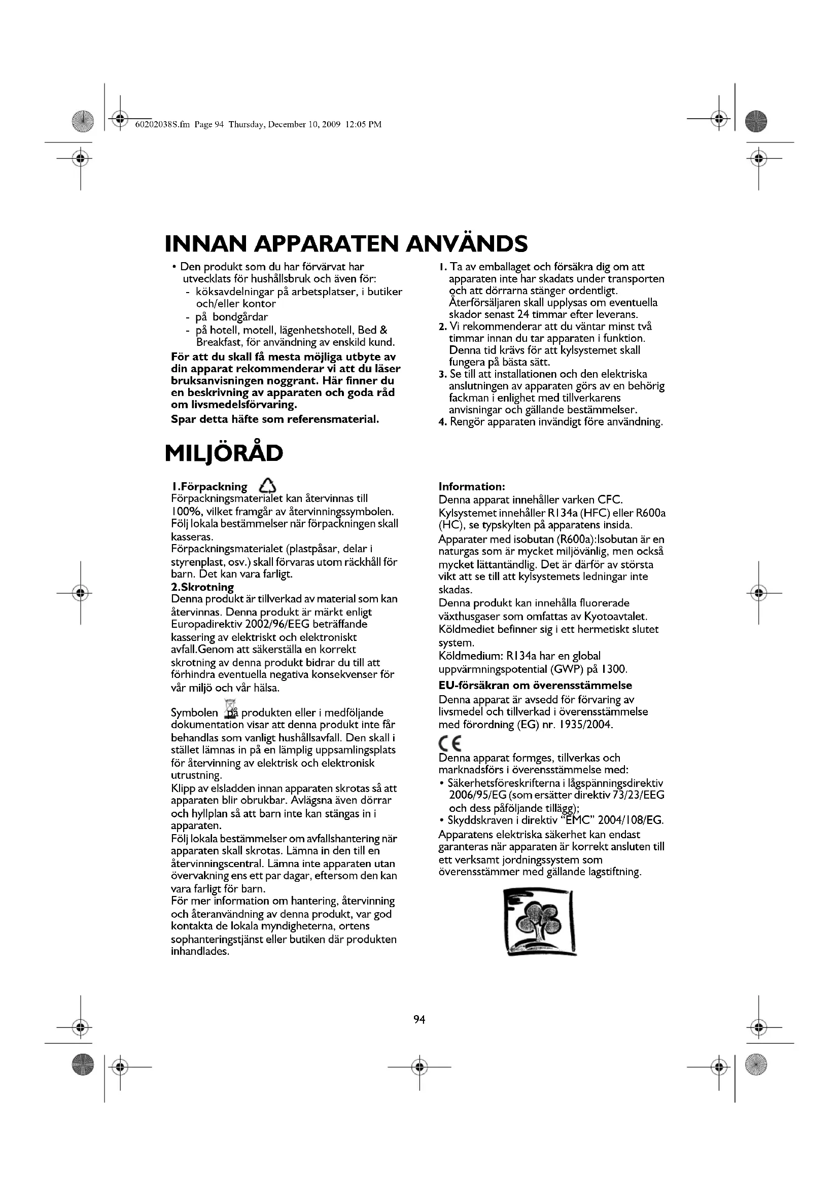 1.Förpackning Förpackningsmaterialet kan återvinnas till 100%, vilket framgår av återvinningssymbolen. Följ lokala bestämmelser när förpackningen skall kasseras. Förpackningsmaterialet (plastpåsar, delar i styrenplast, osv.) skall förvaras utom räckhåll för barn. Det kan vara farligt. 2.Skrotning Denna produkt är tillverkad av material som kan återvinnas. Denna produkt är märkt enligt Europadirektiv 2002/96/EEG beträffande kassering av elektriskt och elektroniskt avfall.Genom att säkerställa en korrekt skrotning av denna produkt bidrar du till att förhindra eventuella negativa konsekvenser för vår miljö och vår hälsa. Symbolen på produkten eller i medföljande dokumentation visar att denna produkt inte får behandlas som vanligt hushållsavfall. Den skall i stället lämnas in på en lämplig uppsamlingsplats för återvinning av elektrisk och elektronisk utrustning. Klipp av elsladden innan apparaten skrotas så att apparaten blir obrukbar. Avlägsna även dörrar och hyllplan så att barn inte kan stängas in i apparaten. Följ lokala bestämmelser om avfallshantering när apparaten skall skrotas. Lämna in den till en återvinningscentral. Lämna inte apparaten utan övervakning ens ett par dagar, eftersom den kan vara farligt för barn. För mer information om hantering, återvinning och återanvändning av denna produkt, var god kontakta de lokala myndigheterna, ortens sophanteringstjänst eller butiken där produkten inhandlades. Information: Denna apparat innehåller varken CFC. Kylsystemet innehåller R134a (HFC) eller R600a (HC), se typskylten på apparatens insida. Apparater med isobutan (R600a):Isobutan är en naturgas som är mycket miljövänlig, men också mycket lättantändlig. Det är därför av största vikt att se till att kylsystemets ledningar inte skadas. Denna produkt kan innehålla fluorerade växthusgaser som omfattas av Kyotoavtalet. Köldmediet befinner sig i ett hermetiskt slutet system. Köldmedium: R134a har en global uppvärmningspotential (GWP) på 1300. EU-försäkran om överensstämmelse Denna apparat är avsedd för förvaring av livsmedel och tillverkad i överensstämmelse med förordning (EG) nr. 1935/2004. Denna apparat formges, tillverkas och marknadsförs i överensstämmelse med: