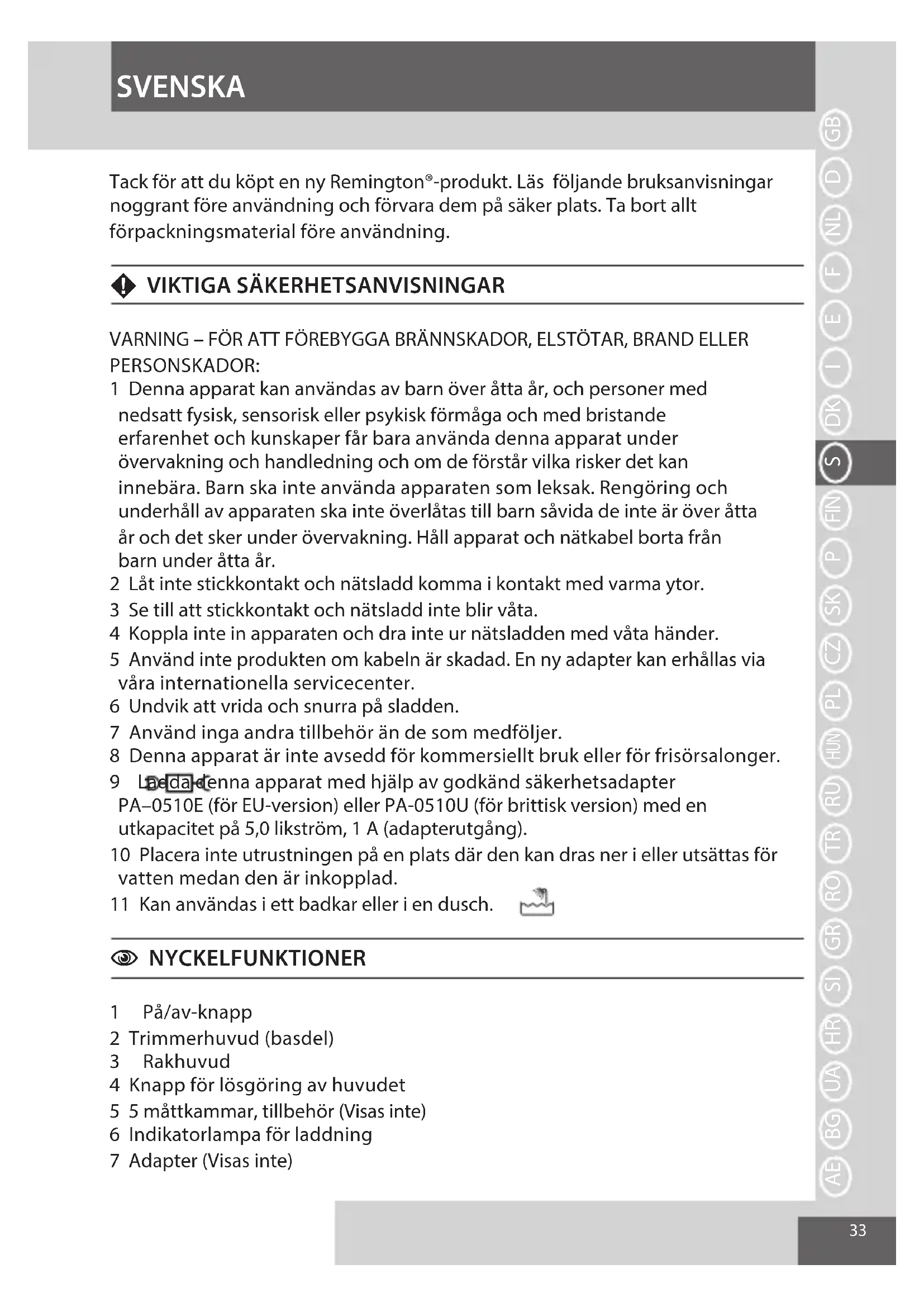 VARNING – FÖR ATT FÖREBYGGA BRÄNNSKADOR, ELSTÖTAR, BRAND ELLER PERSONSKADOR: 1 Denna apparat kan användas av barn över åtta år, och personer med nedsatt fysisk, sensorisk eller psykisk förmåga och med bristande erfarenhet och kunskaper får bara använda denna apparat under övervakning och handledning och om de förstår vilka risker det kan innebära. Barn ska inte använda apparaten som leksak. Rengöring och underhåll av apparaten ska inte överlåtas till barn såvida de inte är över åtta år och det sker under övervakning. Håll apparat och nätkabel borta från barn under åtta år. 2 Låt inte stickkontakt och nätsladd komma i kontakt med varma ytor. 3 Se till att stickkontakt och nätsladd inte blir våta. 4 Koppla inte in apparaten och dra inte ur nätsladden med våta händer. 5 Använd inte produkten om kabeln är skadad. En ny adapter kan erhållas via våra internationella servicecenter. 6 Undvik att vrida och snurra på sladden. 7 Använd inga andra tillbehör än de som medföljer. 8 Denna apparat är inte avsedd för kommersiellt bruk eller för frisörsalonger. 9 Ladda denna apparat med hjälp av godkänd säkerhetsadapter PA–0510E (för EU-version) eller PA-0510U (för brittisk version) med en utkapacitet på 5,0 likström, 1 A (adapterutgång). 10 Placera inte utrustningen på en plats där den kan dras ner i eller utsättas för vatten medan den är inkopplad. 11 Kan användas i ett badkar eller i en dusch. C NYCKELFUNKTIONER 1 På/av-knapp 2 Trimmerhuvud (basdel) 3 Rakhuvud 4 Knapp för lösgöring av huvudet 5 5 måttkammar, tillbehör (Visas inte) 6 Indikatorlampa för laddning 7 Adapter (Visas inte) SVENSKA GBDNLFEIDKSFINPSKCZ HUN PLRUTRROGRSIBG HRUAAE34 8 Skärenhet 9 Foil-Rakblad