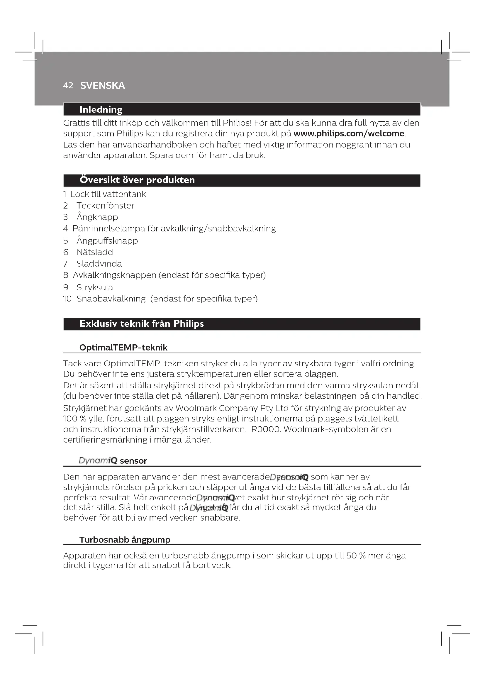 Använda apparaten Obs! Strykjärnet kan avge lite rök första gången du använder det. Det upphör efter en kort stund. Typ av vatten som kan användas Apparaten är konstruerad för att användas med kranvatten. Om du bor i ett område med hårt vatten kan det dock snabbt bildas kalkavlagringar. Vi rekommenderar därför att du använder destillerat eller avmineraliserat vatten för att förlänga apparatens livslängd. Använd inte parfymerat vatten, vatten från torktumlare, ättika, stärkelse, avkalkningsmedel, strykhjälpmedel, kemiskt avkalkat vatten eller andra kemikalier eftersom det kan orsaka vattenstänk, bruna äckar eller skada på apparaten. Strykbara tyger 1 På plaggets tvättetikett står det om det tål strykning (bild 1–3). Stryk inte tyger som inte tål strykning. Stryk inte tryck på plagg. Ånginställningar 1 Om du vill ändra på ånginställningarna lutar du på strykjärnet (ca. 20 grader eller mer) och trycker på ångknappen högst upp på handtaget (bild 1-5) Obs! Alla ånginställningar är utrustade med OptimalTemp-teknik och är säkra att använda på alla strykbara tyger. - ( inställning) (bild 1-6): Aktiveras av sensor, en perfekt mängd ånga produceras automatiskt när det behövs när du rör på strykjärnet. Ånga slutar när strykjärnet är stilla eller när det läggs i ett vertikalt läge. Det rekommenderas att du använder inställningen för så att det blir så praktiskt som möjligt för alla plagg. - (MAX-nställning) (bild 1-7): Den maximala mängden konstant ånga avges för att få bort envisa veck. Vi rekommenderar att du använder MAX-inställningen för att få bästa möjliga resultat på tua tyger som bomull, jeans och linne. Ångan slutar när strykjärnet sätts i ett vertikalt läge. - (ECO-inställning) (endast specika typer) (bild 1-8): Den minsta möjliga mängden konstant ånga avges för plagg med färre veck. Den här inställningen sparar också energi. Ångan slutar när strykjärnet sätts i ett vertikalt läge - (jonisk inställning) (endast specika typer) (bild 1-9): Djupa och kraftfulla joniska ångpuar produceras för mer hygienisk strykning. - (ånga av-inställning) (bild 1-10): Välj den här inställningen om du vill stryka utan ånga. Tips: För alla ånginställningar kan du trycka på ångknappen medan du stryker för att få mer ånga. Automatisk avstängning Den automatiska säkerhetsavstängningsfunktionen stänger av apparaten automatiskt om den vilar på stryksulan och inte har använts på två minuter, och om den står på högkant och inte har använts på åtta minuter. Teckenfönstret blinkar och anger att apparaten är i automatisk avstängningsstatus.SVENSKA
