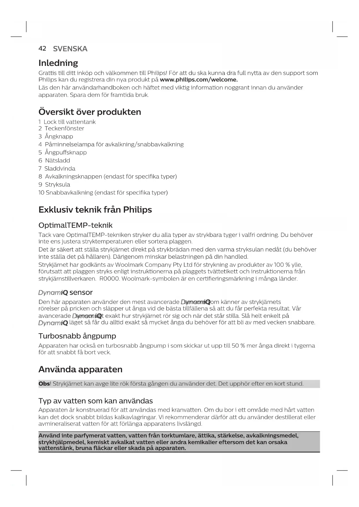 NORSKInledning Grattis till ditt inköp och välkommen till Philips! För att du ska kunna dra full nytta av den support som Philips kan du registrera din nya produkt på www.philips.com/welcome. Läs den här användarhandboken och häftet med viktig information noggrant innan du använder apparaten. Spara dem för framtida bruk. Översikt över produkten 1 Lock till vattentank 2 Teckenfönster 3 Ångknapp 4 Påminnelselampa för avkalkning/snabbavkalkning 5 Ångpusknapp 6 Nätsladd 7 Sladdvinda 8 Avkalkningsknappen (endast för specika typer) 9 Stryksula 10 Snabbavkalkning (endast för specika typer) Exklusiv teknik från Philips OptimalTEMP-teknik Tack vare OptimalTEMP-tekniken stryker du alla typer av strykbara tyger i valfri ordning. Du behöver inte ens justera stryktemperaturen eller sortera plaggen. Det är säkert att ställa strykjärnet direkt på strykbrädan med den varma stryksulan nedåt (du behöver inte ställa det på hållaren). Därigenom minskar belastningen på din handled. Strykjärnet har godkänts av Woolmark Company Pty Ltd för strykning av produkter av 100 % ylle, förutsatt att plaggen stryks enligt instruktionerna på plaggets tvättetikett och instruktionerna från strykjärnstillverkaren. R0000. Woolmark-symbolen är en certieringsmärkning i många länder. sensor Den här apparaten använder den mest avancerade sensorn som känner av strykjärnets rörelser på pricken och släpper ut ånga vid de bästa tillfällena så att du får perfekta resultat. Vår avancerade sensor vet exakt hur strykjärnet rör sig och när det står stilla. Slå helt enkelt på läget så får du alltid exakt så mycket ånga du behöver för att bli av med vecken snabbare. Turbosnabb ångpump Apparaten har också en turbosnabb ångpump i som skickar ut upp till 50 % mer ånga direkt i tygerna för att snabbt få bort veck. Använda apparaten Obs! Strykjärnet kan avge lite rök första gången du använder det. Det upphör efter en kort stund. Typ av vatten som kan användas Apparaten är konstruerad för att användas med kranvatten. Om du bor i ett område med hårt vatten kan det dock snabbt bildas kalkavlagringar. Vi rekommenderar därför att du använder destillerat eller avmineraliserat vatten för att förlänga apparatens livslängd. Använd inte parfymerat vatten, vatten från torktumlare, ättika, stärkelse, avkalkningsmedel, strykhjälpmedel, kemiskt avkalkat vatten eller andra kemikalier eftersom det kan orsaka vattenstänk, bruna äckar eller skada på apparaten.