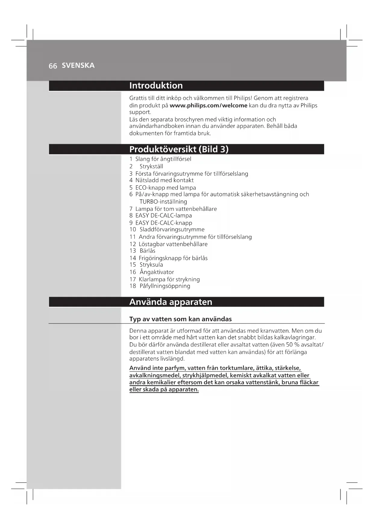 SVENSKA69 Stryka i vertikalt läge Het ånga avges från strykjärnet. Försök aldrig att ta bort veck från ett plagg som används. Använd inte ånga nära din egen eller någon annans hand. Du kan använda strykjärnet i vertikalt läge för att ta bort veck från hängande plagg. 1 Håll strykjärnet vertikalt, tryck på ångaktivatorn och håll stryksulan lätt mot plagget. Ställa ifrån sig strykjärnet under strykning - Under strykningen kan du placera järnet antingen på strykstället eller i vågrätt position på strykbrädan. Tack vare OptimalTemp-tekniken skadar stryksulan inte strykbrädsöverdraget. Energibesparing ECO-läge (eko) - Genom att använda ECO-läget (reducerad mängd ånga) kan du spara energi utan att försämra strykresultatet. Den gröna lampan lyser. - Du kan avaktivera ECO-läget genom att trycka på knappen ECO. Den gröna lampan slocknar då. Automatiskt säkerhetsavstängningsläge - För att spara energi stängs apparaten av automatiskt när den inte använts på 10 minuter. Lampan för automatisk avstängning börjar blinka. - Aktivera apparaten igen genom att trycka på på/av-knappen. Apparaten börjar då värmas upp igen. Obs! Apparaten är inte helt avstängd när den är i säkert avstängningsläge. Stäng av apparaten genom att trycka på på/av- knappen. SVENSKA70 Turboånga Om du vill ha snabbare strykning och en högre mängd ånga kan du använda turboånga. 1 Håll på/av-knappen intryckt i 2 sekunder tills lampan lyser vitt. 2 Avaktivera turboläget genom att hålla på/av-knappen intryckt i 2 sekunder tills den vita lampan lyser blått Tips för strykning Minimera veck medan plaggen torkar Börja med veckborttagningen redan när plaggen torkar genom att sprida ut dem ordentligt efter tvätten och häng upp plagg på galgar så att de torkar med färre veck. Bästa sättet att stryka skjortor Börja med de mer tidskrävande delarna som krage, manschetter och ärmar. Fortsätt sedan med de större partierna som fram- och baksida så att inte de delarna veckas när du stryker de svårare delarna. Krage: När du stryker en krage börjar du med undersidan och jobbar dig utifrån (spetsen) och in. Vänd och upprepa. Vik ned kragen och pressa kanten så att den blir lite styvare. Knappar: Stryk på baksidan av knapparna, det går både snabbare och är mer eektivt. Rengöring och underhåll Underhåll apparaten ordentligt genom att rengöra strykjärnet och apparaten regelbundet. 1 Rengör apparaten med en fuktig trasa. För att avlägsna envisa äckarkanduanvändaenlitenmängddiskmedel. 2 Taenkeltocheektivtbortäckarfrånstryksulangenomattförst slå på apparaten och värma upp den. När apparaten har värmts upp för du strykjärnet över en fuktig trasa samtidigt som du trycker på ångaktivatorn. Tips: Rengör stryksulan regelbundet så att den glider jämnt. 2 sec. SVENSKA71 VIKTIGT – AVKALKNING Det är mycket viktigt att avkalka apparaten när EASY DE-CALC- knappen börjar blinka och apparaten piper kontinuerligt. EASY DE-CALC-knappen börjar blinka och apparaten börjar pipa efter ungefär en månad eller 10 strykningstillfällen för att påminna om att apparaten behöver avkalkas. Utför följande avkalkningsprocedur innan du använder apparaten igen. Undvik brännskador genom att koppla ur apparaten och låta den svalna i minst två timmar innan du utför avkalkningsprocessen. 1 Ta ut stickkontakten ur vägguttaget. 2 Placera apparaten på bordskanten. 3 Håll en kopp (med en volym på minst 350 ml) under EASY-DE-CALC-knappen och vrid knappen moturs. 4 Ta av EASY DE-CALC-knappen och låt vattnet med kalkpartiklar rinna ned i koppen. 5 När inget mer vatten kommer ut ur apparaten sätter du tillbaka EASY DE-CALC-knappen och vrider den medurs för att sätta fast den. SVENSKA72 VIKTIGT – Avkalkning av stryksulan Om du inte använder EASY DE-CALC-funktionen regelbundet kan kalkpartiklarbildasistryksulanochbrunaäckarkankommaut ur stryksulan medan du stryker. I det här läget måste du avkalka stryksulan enligt anvisningarna nedan. Vi rekommenderar att du upprepar proceduren två gånger för att bättre rengöra stryksulan. För att undvika risken för brännskador ska du koppla ur apparaten och låta den svalna i minst två timmar innan du kalkar av stryksulan. 1 Ta ut stickkontakten ur vägguttaget. 2 Placera apparaten på bordskanten. 3 Se till att vattenbehållaren är tom. 4 Hållenkopp(medenvolympåminst350ml)underEASY-DE- CALC-knappen och vrid knappen moturs. 5 Ta av EASY DE-CALC-knappen och låt vattnet med kalkpartiklar rinna ned i koppen. 6 Håll apparaten i det läge där EASY DE-CALC-öppningen är vänd uppåt och häll 900 ml destillerat vatten i öppningen. Obs! Kom ihåg att apparaten är tung när du lutar den. SVENSKA73SVENSKA 7 Ha kvar EASY DE-CALC-öppningen vänd uppåt, sätt tillbaka EASY DE-CALC-knappen och fäst den genom att vrida den medurs. 8 Ställ apparaten på en stabil och jämn yta. Sätt i kontakten och slå på apparaten igen. 9 Vänta fem minuter på att apparaten ska värmas upp. 10 Håll ångaktivatorn intryckt medan du för strykjärnet över en bit tjockt tyg i tre minuter. Varning! Det kommer smutsigt och varmt vatten ut ur stryksulan. 11 Sluta att röra strykjärnet när det inte kommer ut mer vatten eller när ånga börjar avges. 12 Du kan fortsätta att använda apparaten omedelbart. Annars kopplar du ur apparaten efter avkalkningen. Förvaring 1 Stäng av apparaten och dra ur nätsladden. 2 Ta bort vattenbehållaren och töm den. 3 Sätt i strykjärnet i strykstället. Lås fast strykjärnet i strykstället genom att trycka på bärlåset. 4 Vik ihop tillförselslangen och nätsladden och förvara dem i deras respektive förvaringsutrymmen. 5 Du kan bära strykjärnet med en hand genom att hålla i handtaget. Bär inte apparaten genom att hålla i frigöringsspaken för vattentanken.74 Felsökning I det här kapitlet sammanfattas de vanligaste problemen som kan uppstå med apparaten