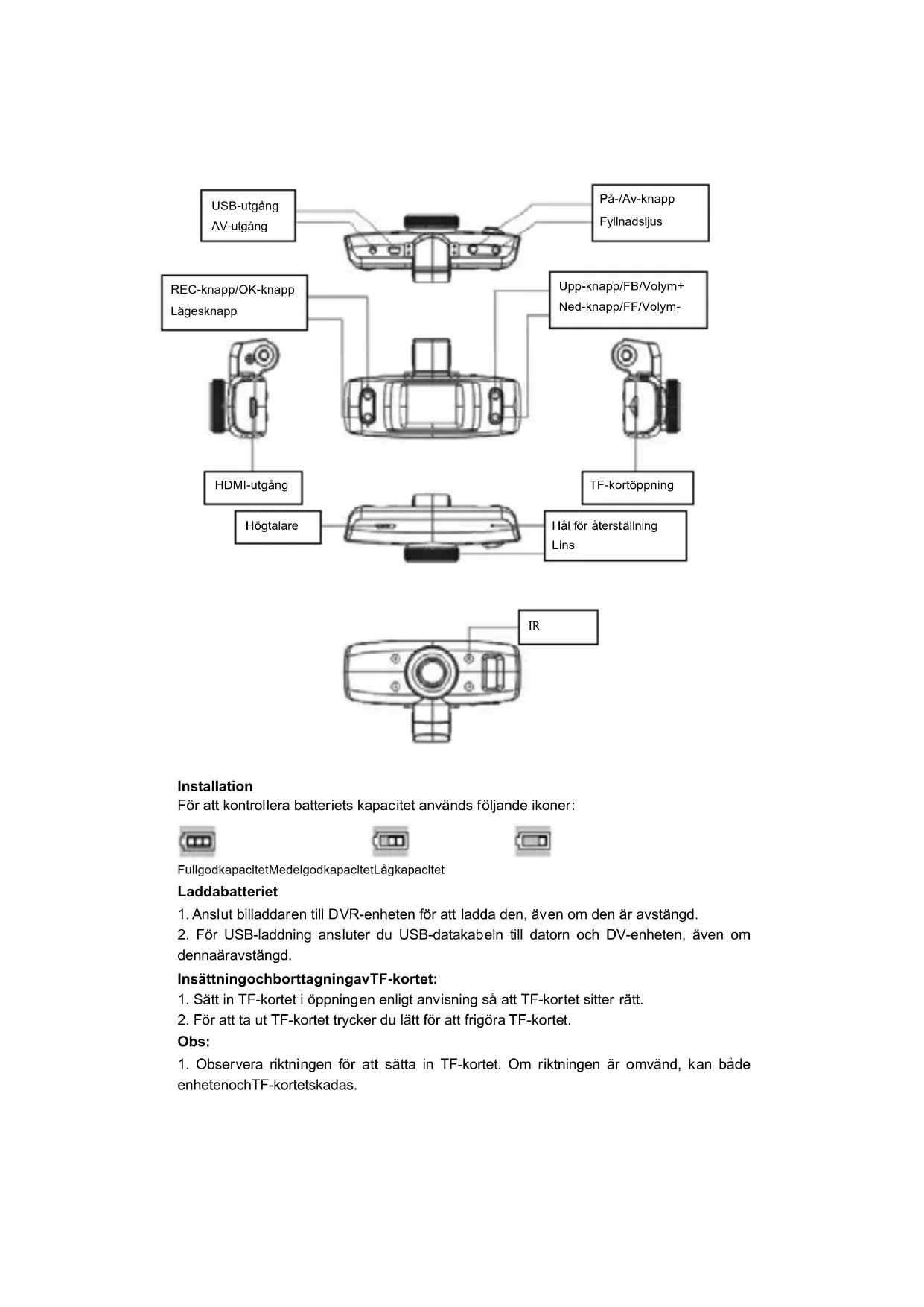 en TV-kabel fr att ansluta DVR-enheten till en TV. Tips: Om drivrutinen inte r installerad kan den flyttbara disken nd3 anvndas nr DVR-enheten rp3slagen. Anm rkning: Om enheten slutar fungera p3 grund av felaktig anvndning trycker du p3 3terstllningsknappen fr 3terstart och 3terstllning. Tekniska data LCD-storlek 1.5',4:3,TFTLCD Lins 120, Klass A+ hgupplst super-vidvinkel. Spr3kalternativ: Spr3kfr alternativ tyska, engelska (standard), franska, spanska, italienska, portugisiska, polska, ryska, hollndska, grekiska, ungerska, tjeckiska, danska, svenska, norska och finska Videostorlek 720P/480P Videoformat AVIFotoupplsning Fotoupplsning 3 M (12 M, 8 M och 5M interpolerat) Fotoformat JPG TF-minneskort TF Mikrofon/Hgtalare Inbyggt Fotograferingslge Sjlvutlsare/(2 s/5 s/10 s)/Kontinuerlig Ljuskllans frekvens 50Hz/60Hz TV-utg3ng NTSC/PAL USB USB2.0 Strmanslutning 5V 500 MA Batteri Inbyggt, 3.7 V, 350 mAh Anmrkningar Windows 2000/XP/Vista/Windows 7/ Windows 8, MAC OSX 10.3.6 eller hgre. Obs: Vi frbeh3ller oss rtten att ndra produktens utfrande och specifikationer, utan freg3ende meddelande.Asennus Seuraavat kuvakkeet ilmoittavat akun tehon: Tysi Keskinkertainen Alhainen Akun lataus
