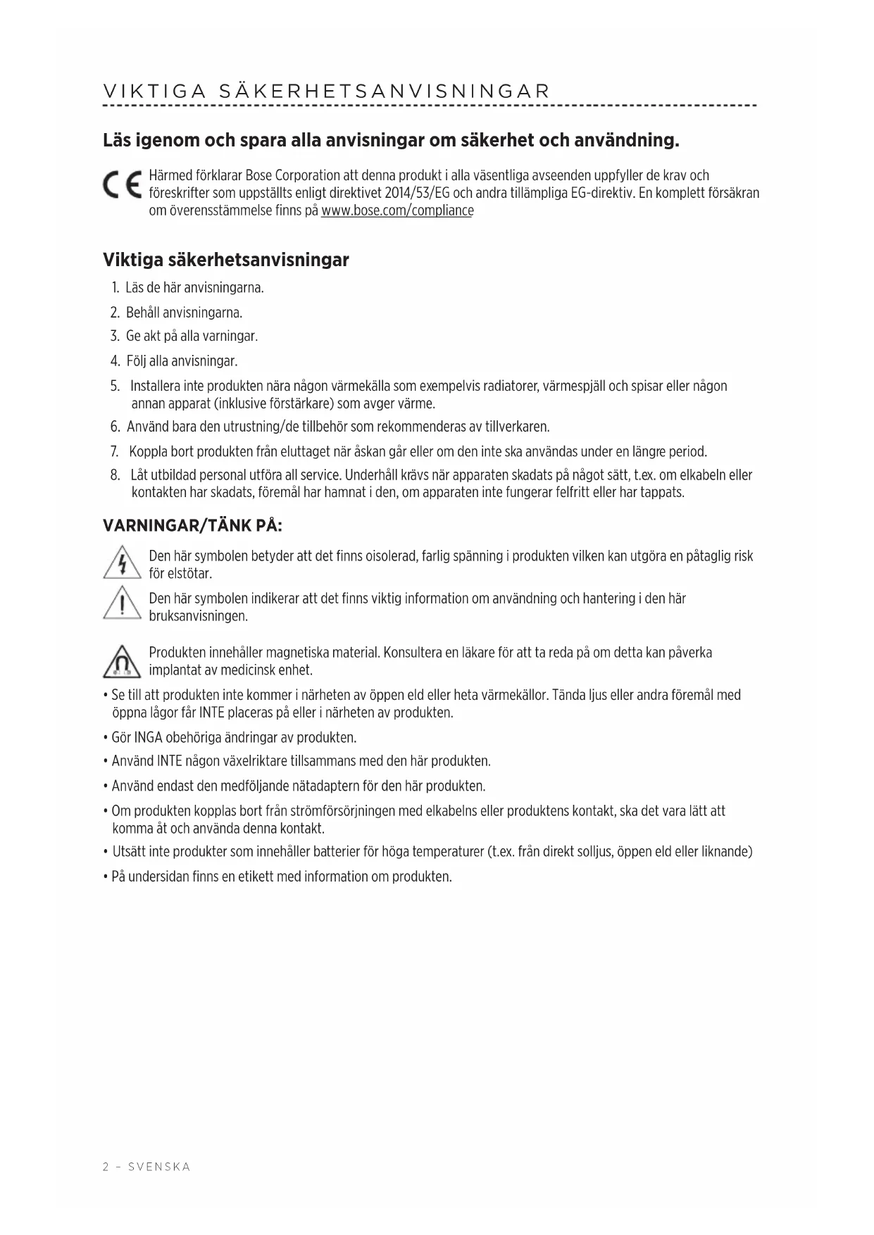 Läs igenom och spara alla anvisningar om säkerhet och användning. Härmed förklarar Bose Corporation att denna produkt i alla väsentliga avseenden uppfyller de krav och föreskrifter som uppställts enligt direktivet 2014/53/EG och andra tillämpliga EG-direktiv. En komplett försäkran om överensstämmelse finns på www.bose.com/compliance Viktiga säkerhetsanvisningar