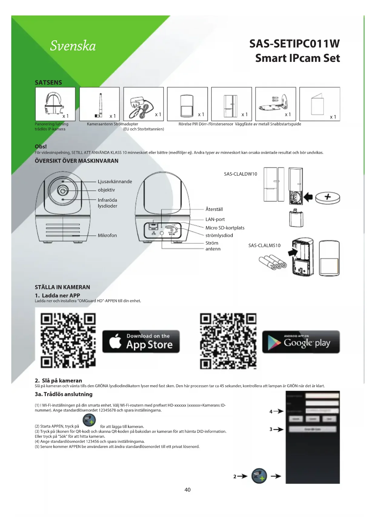 SAS-SETIPC011W Smart IPcam Set Svenska Panorering/lutning trådlös IP-kamera Kameraantenn Strömadapter (EU och Storbritannien)Rörelse PIR Dörr-/fönstersensor Väggfäste av metall Snabbstartsguide41 3b. Trådbunden (1) Kontrollera att din smartphone är ansluten till din Wi-Fi-router. (2) Anslut kameran till Wi-Fi-routern med en Ethernet-kabel. (3) Starta APPEN, tryck på ”Sök” för att hitta kameran. (4) Ange standardlösenordet 123456 och spara inställningarna. (5) Senare kommer APPEN be användaren att ändra standardlösenordet till ett privat lösenord. Obs! I mjukt AP-läge lyser den GRÖNA LYSDIODEN med en lång blinkning följt av två korta blinkningar. I normalläge blinkar lysdioden grönt. Läs användarhandboken för mer information.