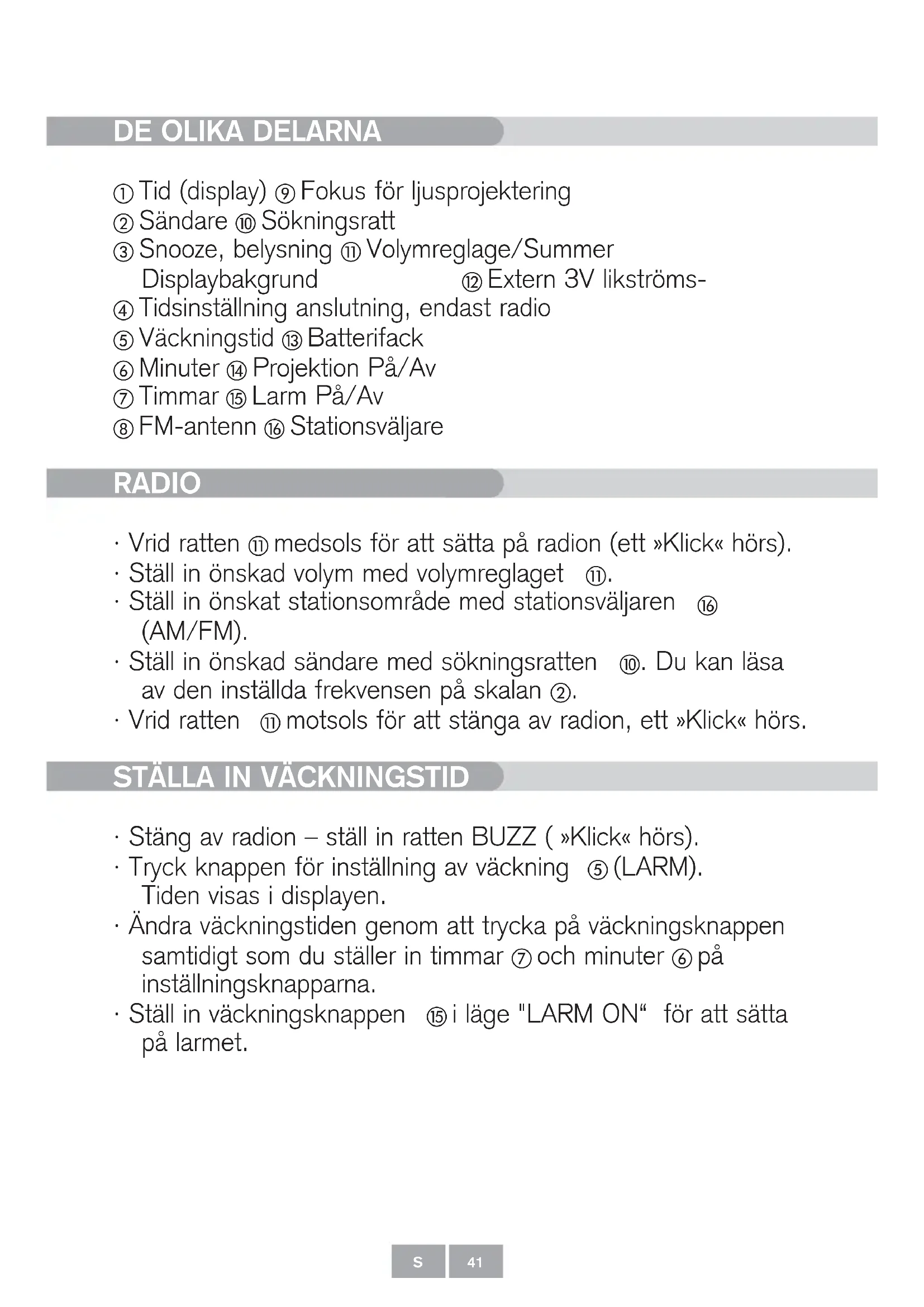 - Ställ in väckningsknappen i läge "LARM ON“ för att sätta på larmet. 41S Manual Projektionsuhr pt9 01.12.2003 14:49 Uhr Seite 41SNOOZE-FUNKTION Tryck på Snooze , väckningen avbryts i 8 minuter. Efter 8 minuter ljuder väckningssignalen igen. Ställ in LARM OFF för att stänga av väckningen.