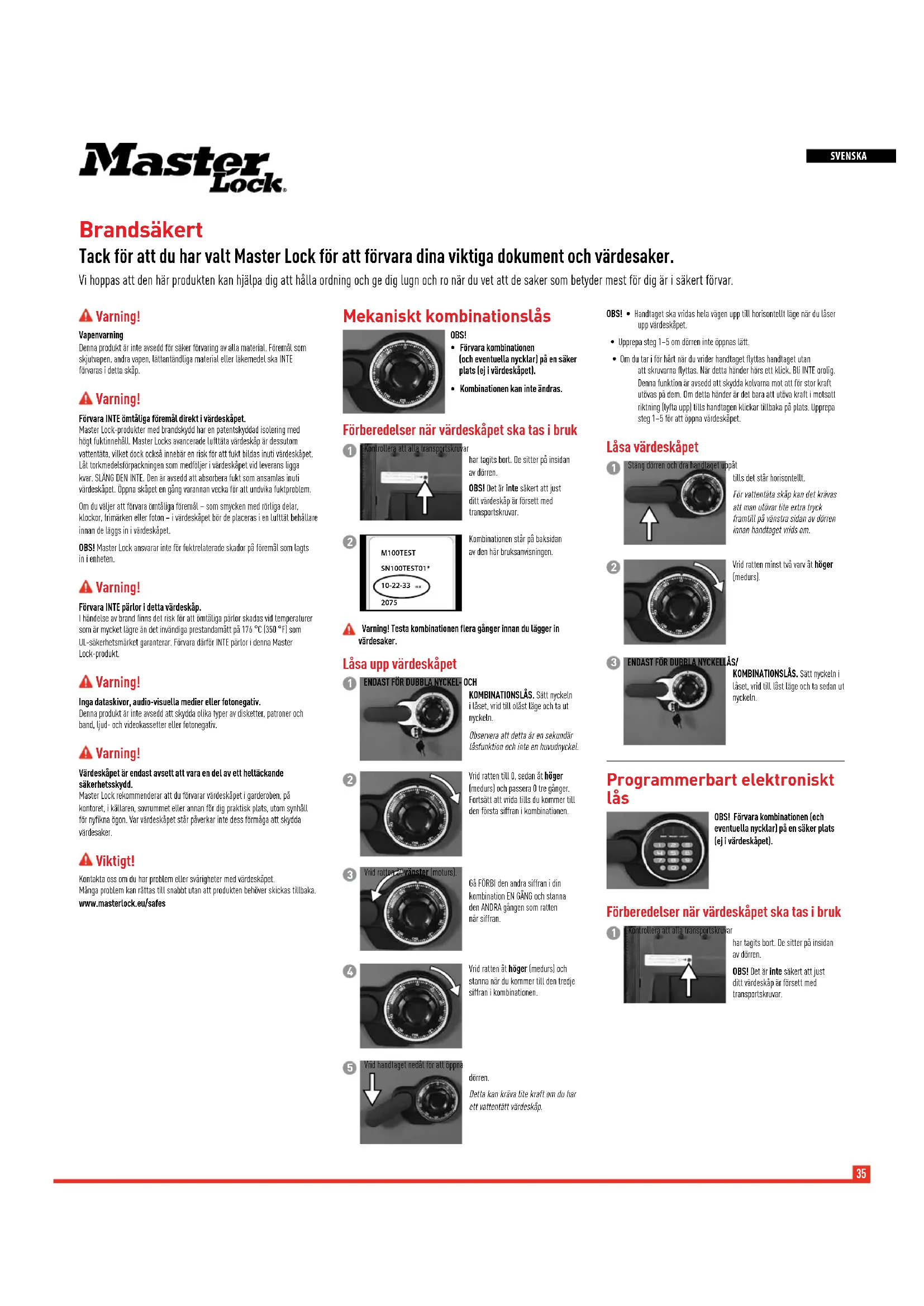 WARNING! Testa kombinationen flera gånger innan du lägger in värdesaker.