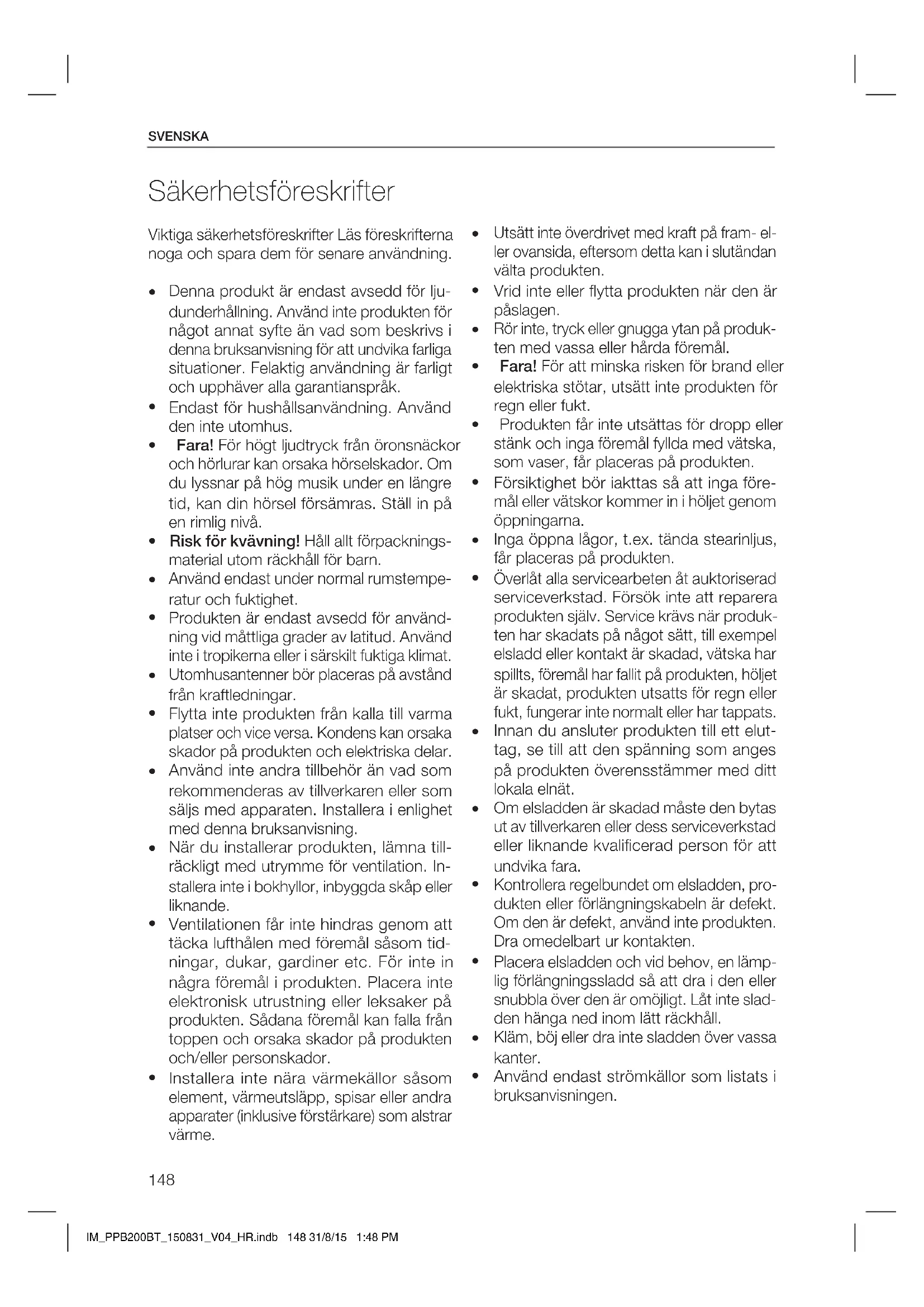 Använd endast strömkällor som listats i bruksanvisningen. IM_PPB200BT_150831_V04_HR.indb 148 31/8/15 1:48 PM149 SVENSKA