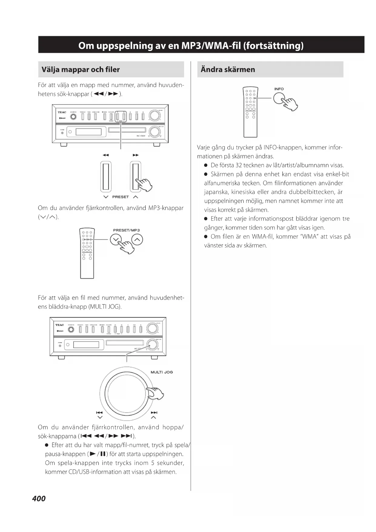 Om du använder fjärrkontrollen, använd hoppa/ sök-knapparna (.m/,/). o Efter att du har valt mapp/fil-numret, tryck på spela/ pausa-knappen (y/9) för att starta uppspelningen. Om spela-knappen inte trycks inom 5 sekunder, kommer CD/USB-information att visas på skärmen. Ändra skärmen Varje gång du trycker på INFO-knappen, kommer infor- mationen på skärmen ändras. o De första 32 tecknen av låt/artist/albumnamn visas. o Skärmen på denna enhet kan endast visa enkel-bit alfanumeriska tecken. Om filinformationen använder japanska, kinesiska eller andra dubbelbittecken, är uppspelningen möjlig, men namnet kommer inte att visas korrekt på skärmen. o Efter att varje informationspost bläddrar igenom tre gånger, kommer tiden som har gått visas igen. o Om filen är en WMA-fil, kommer ”WMA” att visas på vänster sida av skärmen.401 SVENSKA Exempel på skärm när CD-funktionen är aktiv. Filnummer Uppspelad tid