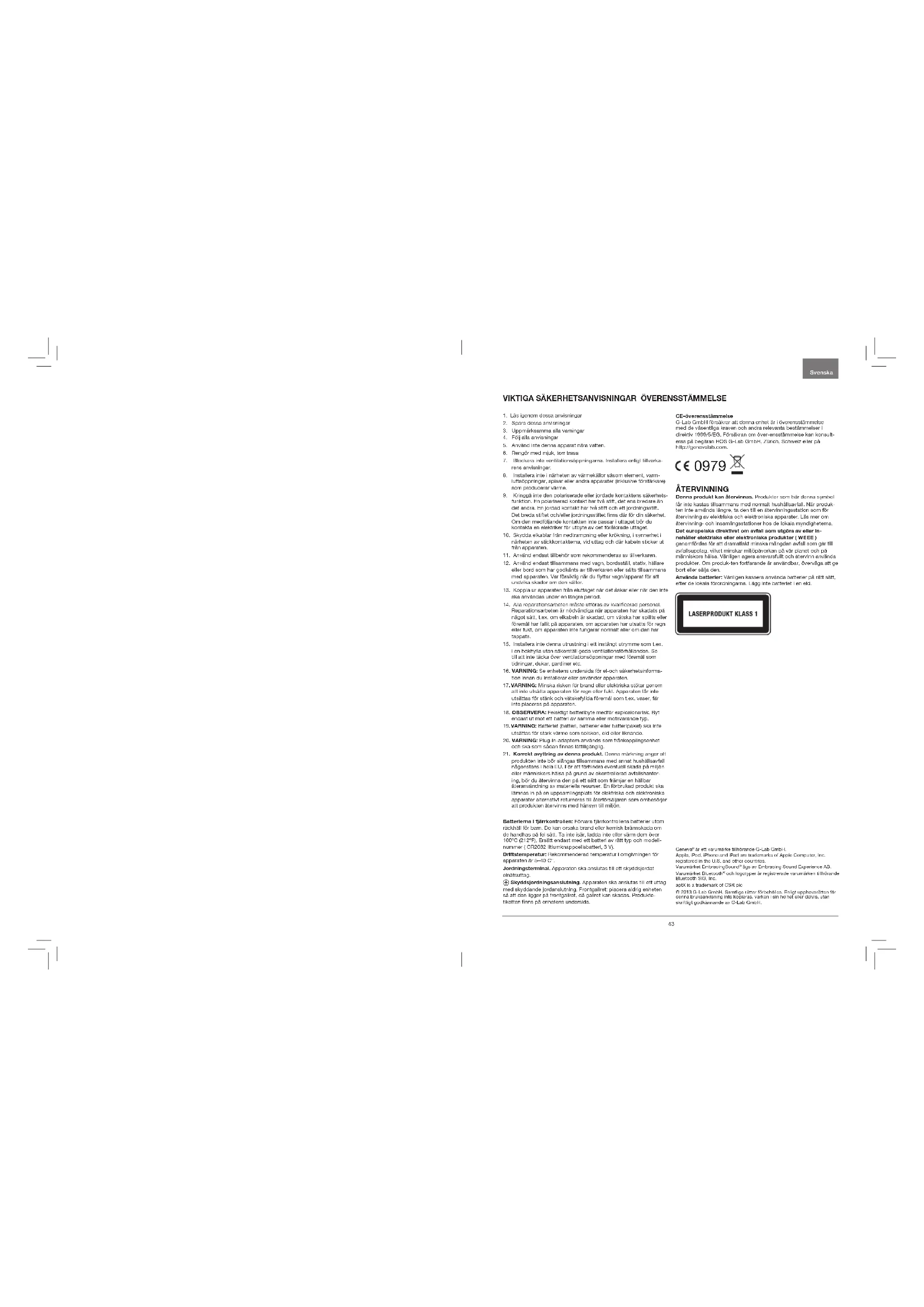 Dansk43 1. Läs igenom dessa anvisningar2. Spara dessa anvisningar3. Uppmärksamma alla varningar4. Följ alla anvisningar5. Använd inte denna apparat nära vatten. 6. Rengör med mjuk, torr trasa7. Blockera inte ventilationsöppningarna. Installera enligt tillverka-rens anvisningar.8. Installera inte i närheten av värmekällor såsom element, varm-luftsöppningar, spisar eller andra apparater (inklusive förstärkare) som producerar värme. 9. Kringgå inte den polariserade eller jordade kontaktens säkerhets-funktion. En polariserad kontakt har två stift, det ena bredare än det andra. En jordad kontakt har två stift och ett jordningsstift. Det breda stiftet och/eller jordningsstiftet nns där för din säkerhet. Om den medföljande kontakten inte passar i uttaget bör du kontakta en elektriker för utbyte av det föråldrade uttaget.10. Skydda elkablar från nedtrampning eller krökning, i synnerhet i närheten av stickkontakterna, vid uttag och där kabeln sticker ut från apparaten.11. Använd endast tillbehör som rekommenderas av tillverkaren.12. Använd endast tillsammans med vagn, bordsställ, stativ, hållare eller bord som har godkänts av tillverkaren eller sålts tillsammans med apparaten. Var försiktig när du yttar vagn/apparat för att undvika skador om den välter.13. Koppla ur apparaten från eluttaget när det åskar eller när den inte ska användas under en längre period.14. Alla reparationsarbeten måste utföras av kvalicerad personal. Reparationsarbeten är nödvändiga när apparaten har skadats på något sätt, t.ex. om elkabeln är skadad, om vätska har spillts eller föremål har fallit på apparaten, om apparaten har utsatts för regn eller fukt, om apparaten inte fungerar normalt eller om den har tappats.15. Installera inte denna utrustning i ett instängt utrymme som t.ex. i en bokhylla utan säkerställ goda ventilationsförhållanden. Se till att inte täcka över ventilationsöppningar med föremål som tidningar, dukar, gardiner etc.16. VARNING: Se enhetens undersida för el-och säkerhetsinforma-tion innan du installerar eller använder apparaten.