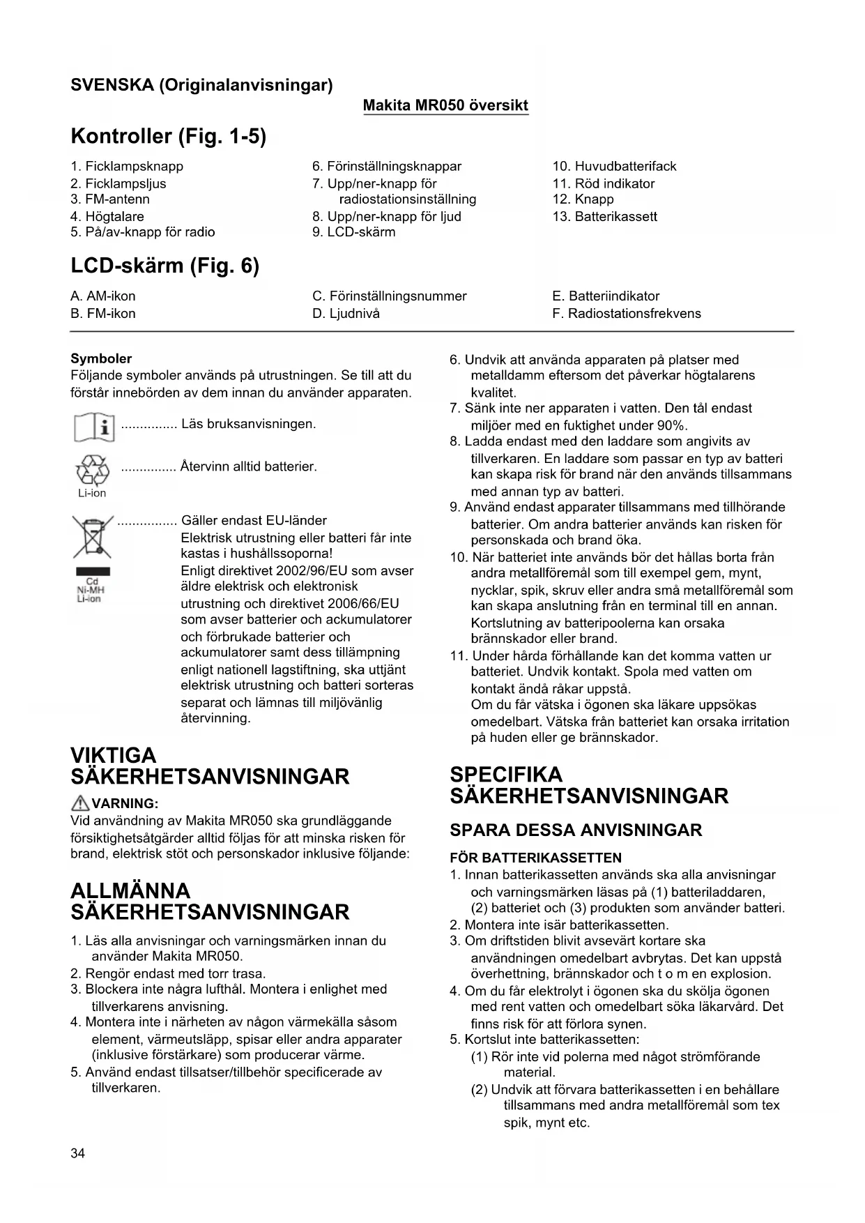 och radions på/av-knapp [ ] i cirka 5 sekunder. När alla ikoner visas på LCD-skärmen är alla förinställda minnen tillbaka till fabriksinställning. Användning av ficklampa (Fig. 7) VARNING: Titta inte direkt in i ljuset när lampan är tänd för att minska risken för skada. VARNING: Använd INTE arbetsljus utan att kanttillsatsen är på plats för att minska risken för skada. Användning och justering av det svängbara huvudet Tryck på ficklampsknappen [ ] för att sätta på/stänga av ficklampan när radion antingen är på eller av. Obs: Det svängbara huvudet kan svänga i en 150 graders skala och kan justeras i 6 steg. Sväng huvudet till önskat läge. Låt spärrhaken knäppa igen på plats. Viktigt: Forcera inte när du svänger huvudet. Bakgrundsljus för LCD Genom att trycka på någon av kontrollknapparna lyser LCD-skärmen upp i cirka 10 sekunder. Specifikationer Underhåll För att upprätthålla produktens säkerhet och tillförlitlighet bör reparationer, underhålls- och justeringsåtgärder utföras av ett auktoriserat Makita servicecenter. Modell BMR050 Strömkälla D.C.14,4 V/18 V LED 1,4 W x 3 Skala för inställningsfrekvens AM: 522-1 629 kHz FM: 87,5-108 MHz Högtalare ø51 mm 8 3 W Uteffekt (18V) 3,0 W Endast radio Endast ljus Radio/ljus Användningsintervall (med radions uteffekt 100 mW) BL1415 11 timmar 3,5 timmar 2,5 timmar BL1430 25 timmar 8,5 timmar 6 timmar BL1815 11 timmar 3,5 timmar 2,5 timmar BL1830 25 timmar 8,5 timmar 6 timmar Mått (Med batteri BL1430) 263 mm x 75 mm x 196 mm Nettovikt 0,95 kg (med batteri BL1415) 1,14 kg (med batteri BL1430) 1,01 kg (med batteri BL1815) 1,23 kg (med batteri BL1830)37 NORSK (Originalinstruksjoner) Makita MR050 Oversikt Kontroller (Fig. 1-5) LCD-display (Fig. 6) Symboler Nedenfor ser du symbolene som brukes for dette utstyret. Forsikre deg om at du forstår hva de betyr, før du begynner å bruke verktøyet. ............... Les bruksanvisningen. ............... Batterier må alltid resirkuleres ................ Gjelder bare for EU-land Kast aldri elektriske produkter eller batterier i husholdningsavfallet! I henhold til EU-direktiv 2002/96/EF om kasserte elektriske og elektroniske produkter og direktiv 2006/66/EF om batterier og akkumulatorer og brukte batterier og akkumulatorer, og deres iverksetting i nasjonal rett, må elektriske produkter og batterier som ikke lenger skal brukes, samles separat og returneres til et miljøvennlig gjenvinningsanlegg. VIKTIGE VERNEINSTRUKSJONER ADVARSEL: Ved bruk av Makita MR050, må grunnleggende forholdsregler alltid bli fulgt for å redusere faren for brann, elektrisk støt og helseskader, inkludert følgende: GENERELLE SIKKERHETSREGLER