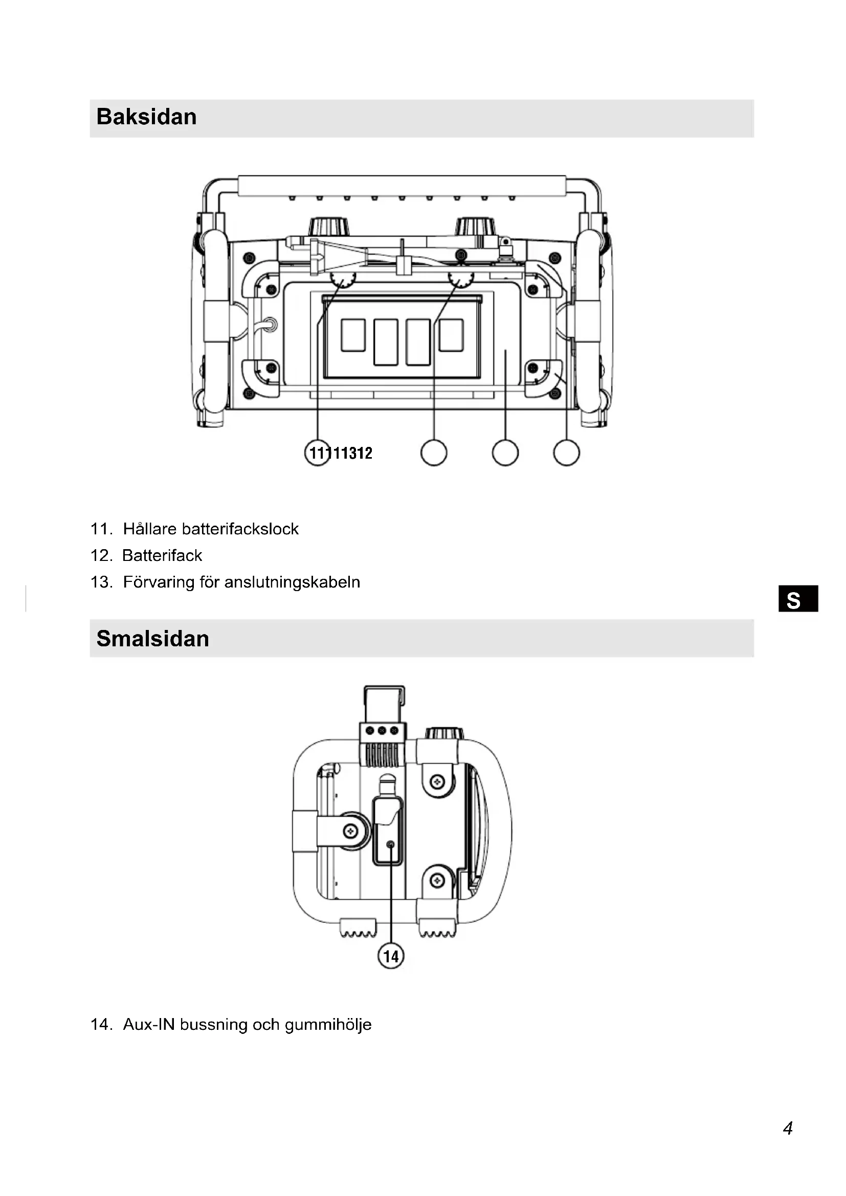 På smalsidan nns bakom gummihöljet en 3,5 mm stereo Aux IN bussning för inkoppling av externa audioapparater som t.ex. en MP3-spelare eller en CD-spelare.