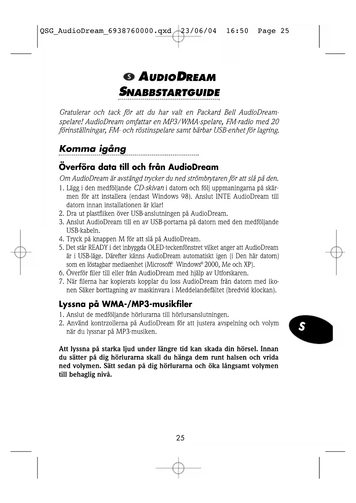men för att installera (endast Windows 98). Anslut INTE AudioDream tilldatorn innan installationen är klar!2. Dra ut plastfliken över USB-anslutningen på AudioDream. 3. Anslut AudioDream till en av USB-portarna på datorn med den medföljandeUSB-kabeln. 4. Tryck på knappen M för att slå på AudioDream. 5. Det står READY i det inbyggda OLED-teckenfönstret vilket anger att AudioDreamär i USB-läge. Därefter känns AudioDream automatiskt igen (i Den här datorn)som en löstagbar mediaenhet (Microsoft Windows 2000, Me och XP). 6. Överför filer till eller från AudioDream med hjälp av Utforskaren. 7. När filerna har kopierats kopplar du loss AudioDream från datorn med iko-nen Säker borttagning av maskinvara i Meddelandefältet (bredvid klockan). Lyssna på WMA-/MP3-musikfiler 1. Anslut de medföljande hörlurarna till hörlursanslutningen. 2. Använd kontrzollerna på AudioDream för att justera avspelning och volymnär du lyssnar på MP3-musiken. Att lyssna på starka ljud under längre tid kan skada din hörsel. Innandu sätter på dig hörlurarna skall du hänga dem runt halsen och vridaned volymen. Sätt sedan på dig hörlurarna och öka långsamt volymentill behaglig nivå.