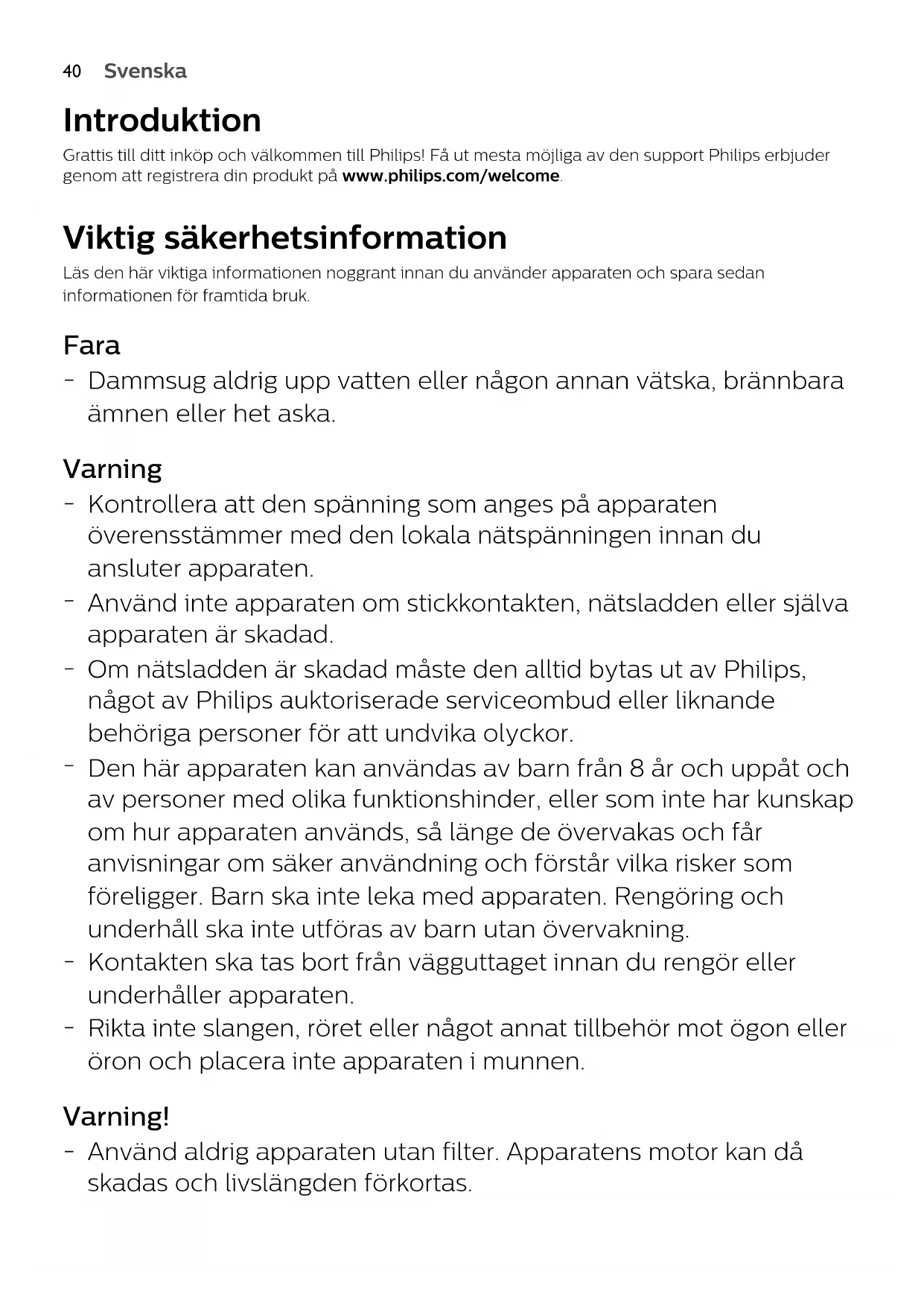 SuomiSvenska Introduktion Grattis till ditt inköp och välkommen till Philips! Få ut mesta möjliga av den support Philips erbjudergenom att registrera din produkt på www.philips.com/welcome. Viktig säkerhetsinformation Läs den här viktiga informationen noggrant innan du använder apparaten och spara sedaninformationen för framtida bruk. Fara