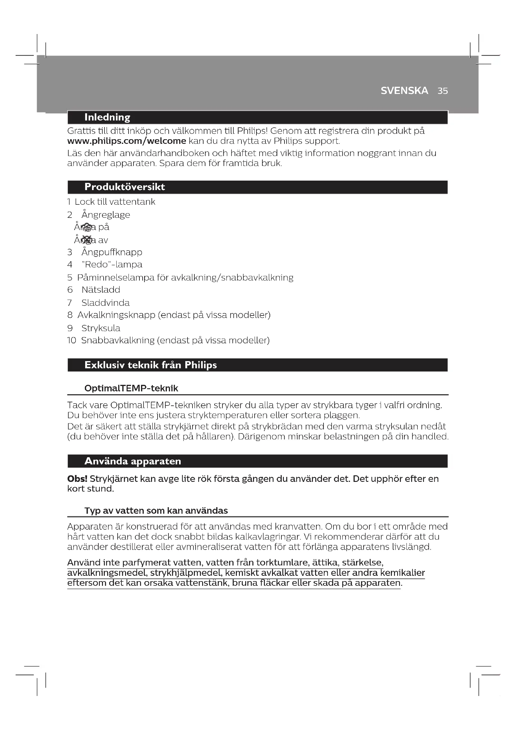 Strykbara tyger 1 Läs på plaggets tvättetikett om det tål strykning (g. 1-5). Stryk inte tyger som inte tål strykning. Stryk inte tryck på plagg. Stryk med extra ånga Håll ångpusknappen nedtryckt om du behöver mer ånga för att släta ut envisa veck. Automatisk avstängning Den automatiska avstängningsfunktionen stänger av apparaten automatiskt om den vilar på stryksulan och inte har använts på två minuter, och om den står på högkant och inte har använts på åtta minuter. ”Redo”-lampan blinkar och anger att apparaten är i automatisk avstängningsstatus. Ta upp apparaten eller ytta den lite om du vill värma upp den igen. ”Redo”-lampan börjar blinka och apparaten värms upp. Rengöring och underhåll Mer information om hur du rengör och underhåller strykjärnet ges i videoklippen via följande länk: http://www.philips.com/descaling-iron. Rengöra stryksulan 1 Dra ut nätsladden och låt apparaten svalna. 2 Häll ut överödigt vatten från vattentanken. 3 Torka av agor och andra avlagringar från stryksulan med en fuktad trasa och ett ytande rengöringsmedel utan slipmedel. Obs! Du håller stryksulan slät genom att inte låta den komma i kontakt med metallföremål. Använd aldrig skursvamp, ättika eller andra kemikalier när du rengör stryksulan. Snabbavkalkning (endast på vissa modeller) VIKTIGT! Snabbavkalkningen samlar automatiskt upp lösa kalkpartiklar under strykningen. Efter 1–3 månaders användning börjar avkalkningspåminnelselampan blinka för att påminna dig om att använda snabbavkalkningsfunktionen (g. 2-1). Funktionens syfte är att avlägsna kalkavlagringar som samlats upp av strykjärnet och på så sätt förlänga dess livslängd. När avkalkningspåminnelselampan blinkar värms inte strykjärnet upp. Tips! Snabbavkalkningsfunktionen kan användas när som helst, även om inte påminnelselampan har aktiverats. Använd funktionen oftare om du bor i ett område med hårt vatten. Utför inte snabbavkalkning när strykjärnet är varmt. Häll inte vatten i snabbavkalkningsöppningen. 1 Dra ut nätsladden (g. 2-2) och säkerställ att apparaten är sval (g. 2-3). 2 Håll apparaten i ett vertikalt läge över diskhon. 3 Fäll upp iken på snabbavkalkningsuppsamlaren (g. 2-4) och ta ut uppsamlaren (g. 2-5).SVENSKA