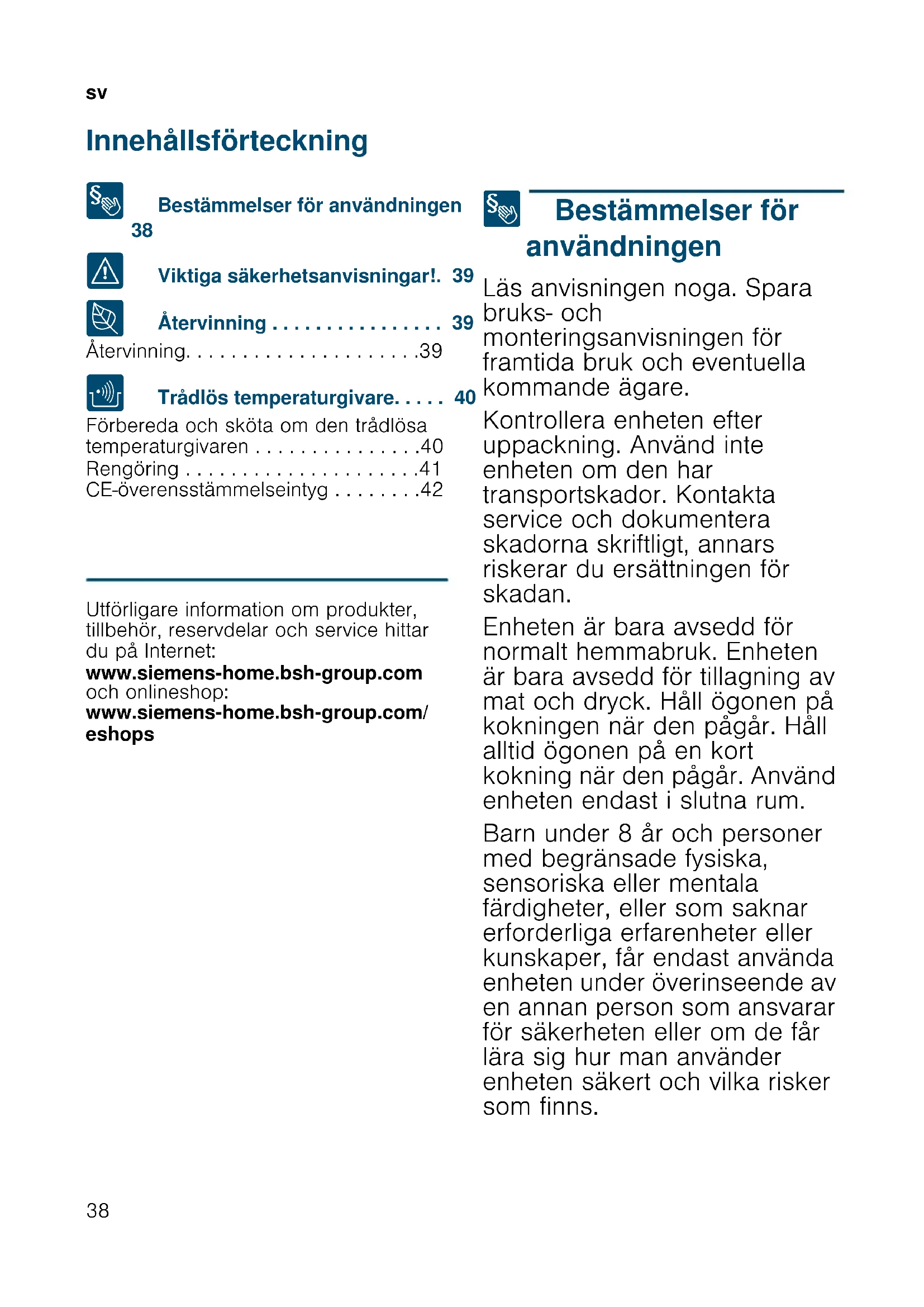 - CE-överensstämmelseintyg Produktinfo Utförligare information om produkter, tillbehör, reservdelar och service hittar du på Internet: www.siemens-home.bsh-group.com och onlineshop: www.siemens-home.bsh-group.com/ eshops 8 Bestämmelser för användningen Bestämmelser för användningen Läs anvisningen noga. Spara bruks- och monteringsanvisningen för framtida bruk och eventuella kommande ägare. Kontrollera enheten efter uppackning. Använd inte enheten om den har transportskador. Kontakta service och dokumentera skadorna skriftligt, annars riskerar du ersättningen för skadan. Enheten är bara avsedd för normalt hemmabruk. Enheten är bara avsedd för tillagning av mat och dryck. Håll ögonen på kokningen när den pågår. Håll alltid ögonen på en kort kokning när den pågår. Använd enheten endast i slutna rum. Barn under 8 år och personer med begränsade fysiska, sensoriska eller mentala färdigheter, eller som saknar erforderliga erfarenheter eller kunskaper, får endast använda enheten under överinseende av en annan person som ansvarar för säkerheten eller om de får lära sig hur man använder enheten säkert och vilka risker som finns.sv p. 42