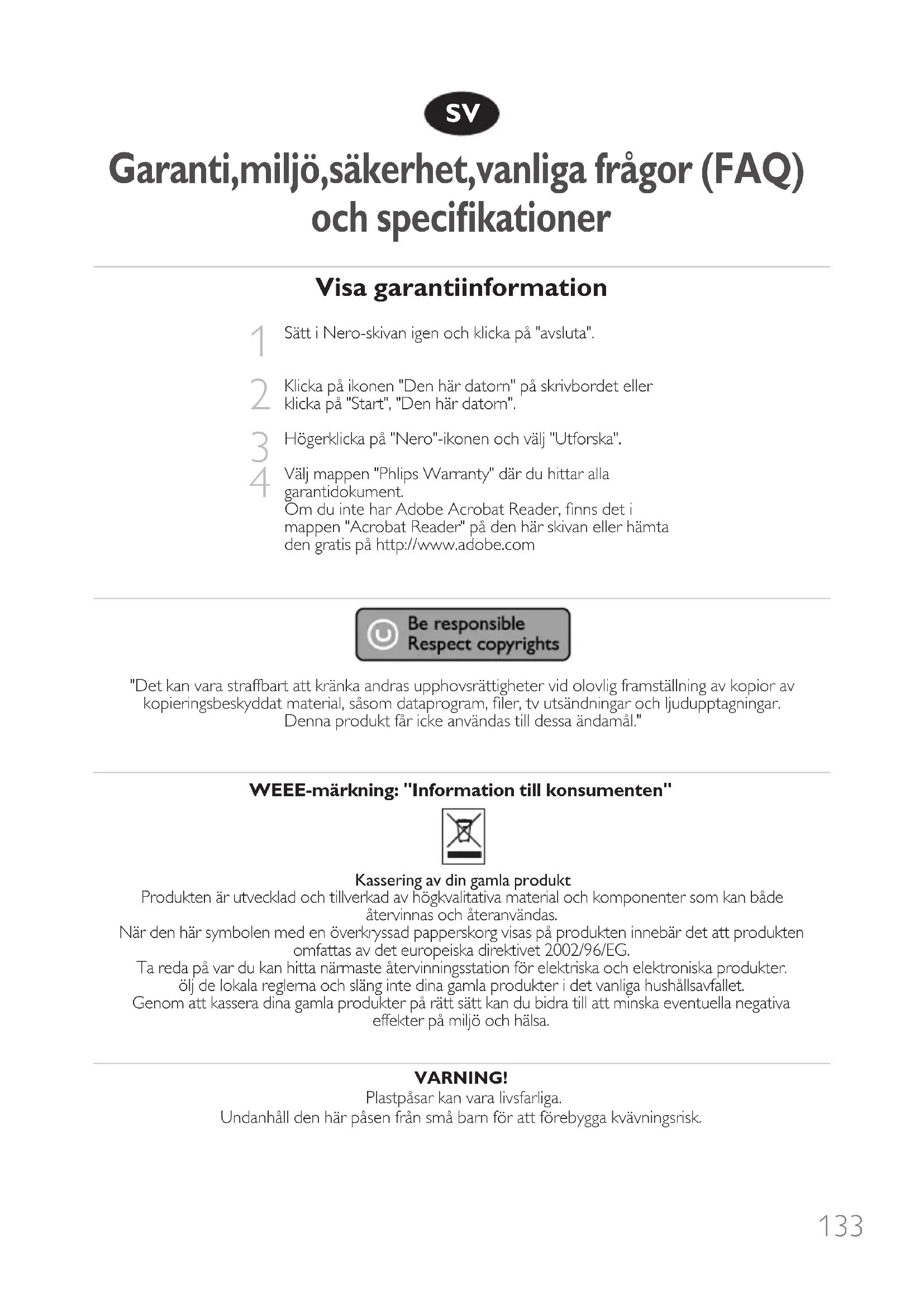 Välj mappen "Phlips Warranty" där du hittar alla garantidokument. Om du inte har Adobe Acrobat Reader, finns det i mappen "Acrobat Reader" på den här skivan eller hämta den gratis på http://www.adobe.com "Det kan vara straffbart att kränka andras upphovsrättigheter vid olovlig framställning av kopior av kopieringsbeskyddat material, såsom dataprogram, filer, tv utsändningar och ljudupptagningar. Denna produkt får icke användas till dessa ändamål." WEEE-märkning: "Information till konsumenten" Kassering av din gamla produkt Produkten är utvecklad och tillverkad av högkvalitativa material och komponenter som kan både återvinnas och återanvändas. När den här symbolen med en överkryssad papperskorg visas på produkten innebär det att produkten omfattas av det europeiska direktivet 2002/96/EG. Ta reda på var du kan hitta närmaste återvinningsstation för elektriska och elektroniska produkter. ölj de lokala reglerna och släng inte dina gamla produkter i det vanliga hushållsavfallet. Genom att kassera dina gamla produkter på rätt sätt kan du bidra till att minska eventuella negativa effekter på miljö och hälsa. VARNING! Plastpåsar kan vara livsfarliga. Undanhåll den här påsen från små barn för att förebygga kvävningsrisk. Garanti,miljö,säkerhet,vanliga frågor (FAQ) och specifikationer SV134 Vanliga frågor (FAQ) Fråga 1: Jag har en dator med Windows 98 Second Edition och det finns ingen CD-ROM- enhet i datorn men jag har en annan dator. Hur installerar jag drivrutinerna?