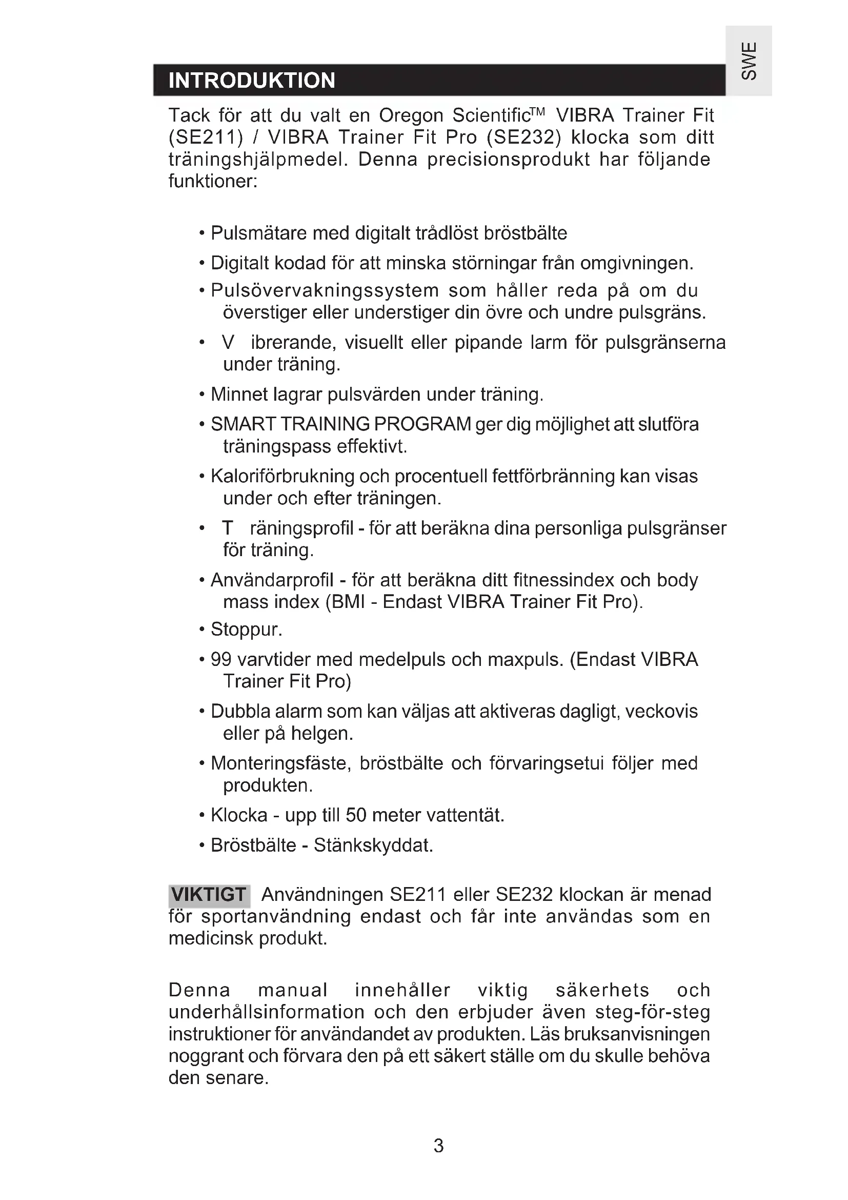 - Bröstbälte - Stänkskyddat. Användningen SE211 eller SE232 klockan är menad för sportanvändning endast och får inte användas som en medicinsk produkt. Denna manual innehåller viktig säkerhets och underhållsinformation och den erbjuder även steg-för-steg instruktioner för användandet av produkten. Läs bruksanvisningen noggrant och förvara den på ett säkert ställe om du skulle behöva den senare. VIKTIGT SE211 Swedish R5 OP_OK.p65 2006.1.6, 11:27 PM34 SWE HUVUDFUNKTIONER KLOCKA SE211 - VIBRA Trainer Fit