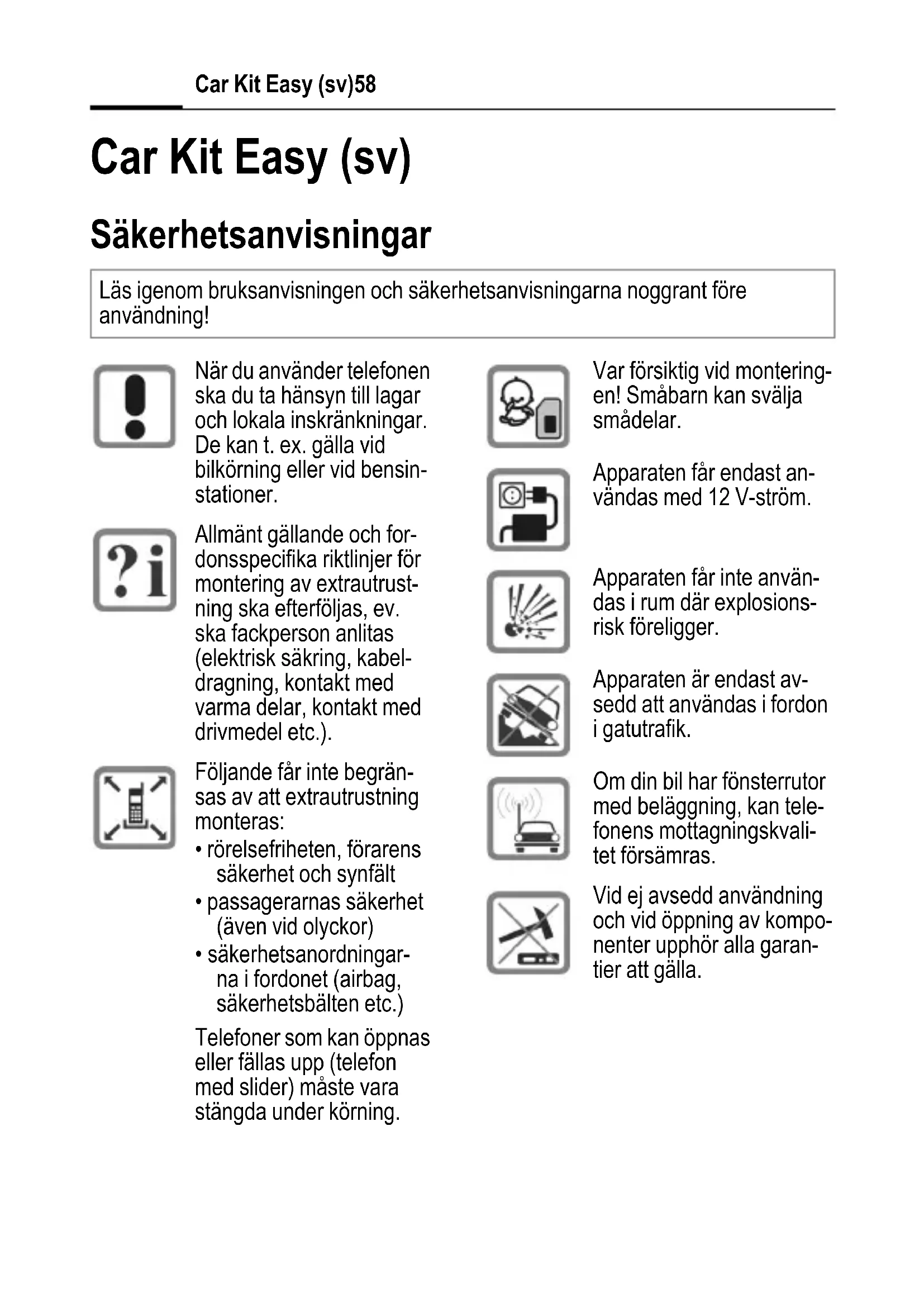 - säkerhetsanordningar- na i fordonet (airbag, säkerhetsbälten etc.) Telefoner som kan öppnas eller fällas upp (telefon med slider) måste vara stängda under körning. Var försiktig vid montering- en! Småbarn kan svälja smådelar. Apparaten får endast an- vändas med 12 V-ström. Apparaten får inte använ- das i rum där explosions- risk föreligger. Apparaten är endast av- sedd att användas i fordon i gatutrafik. Om din bil har fönsterrutor med beläggning, kan tele- fonens mottagningskvali- tet försämras. Vid ej avsedd användning och vid öppning av kompo- nenter upphör alla garan- tier att gälla.59Car Kit Easy (sv) Ytterligare driftsanvisningar hittar du i manualen till din mobiltelefon. Ta hänsyn till kompabilitetstabellen på förpackningen. Endast de telefo- ner som nämns i tabellen passar i respektive hållare. Om du placerar andra telefoner än de som nämns i tabellen i en hållare, kan telefonen inte låsas ordentligt och telefon resp. hållare kan komma att skadas. Tänk på: Avfallshantera förbrukade telefoner och tillbehör i enlighet med tillämpliga lagar. Avlägsna ev. lock från ka- meran och från stickkon- takterna innan du placerar telefonen i hållaren. Annars kan anslutnings- ställena skadas (t. ex. stickproppskoppling till telefonhållare). Använd endast Siemens- originaltillbehör. På så sätt undviker du eventuella person- och materialska- dor och säkerställer att alla relevanta bestämmelser efterföljs.Car Kit Easy (sv)60 Den bilmonterade handsfree- anordningen Car Kit Easy kallas "Car Kit" i följande dokumentation. Den är avsedd att användas i ett 12 V-uttag (cigarettändare). I leveransen ingår huvudmodu- len för Car Kit med hållare, samt en mikrofon med fästklämmor och limplatta (du kan välja mel- lan dessa fästanordningar). Car Kit är avsedd för de Siemens- telefoner som nämns i kompabi- litetstabellen på förpackningen. För att kunna använda din tele- fon tillsammans med Car Kit, måste du byta hållare. Kontrolle- ra kompabilitetsuppgifterna på baksidan av hållaren. Byta hållare Genom att byta hållare på Car Kit kan du använda den med en an- nan Siemens-telefontyp. Lossa vid behov först mikrofo- nen med klammer från hållaren. På hållarens baksida finns en flik. Dra lätt i denna (A) och dra däref- ter hållaren uppåt (B). Sätt i den nya hållaren i spåret och tryck den nedåt tills den fäster (C). Sätt eventuellt fast mikrofonen med klammer på hållaren. Tips Montera inte och använd inte Car Kit utan hållare. Då riskerar du att funktio- nerna och säkerheten äventyras.