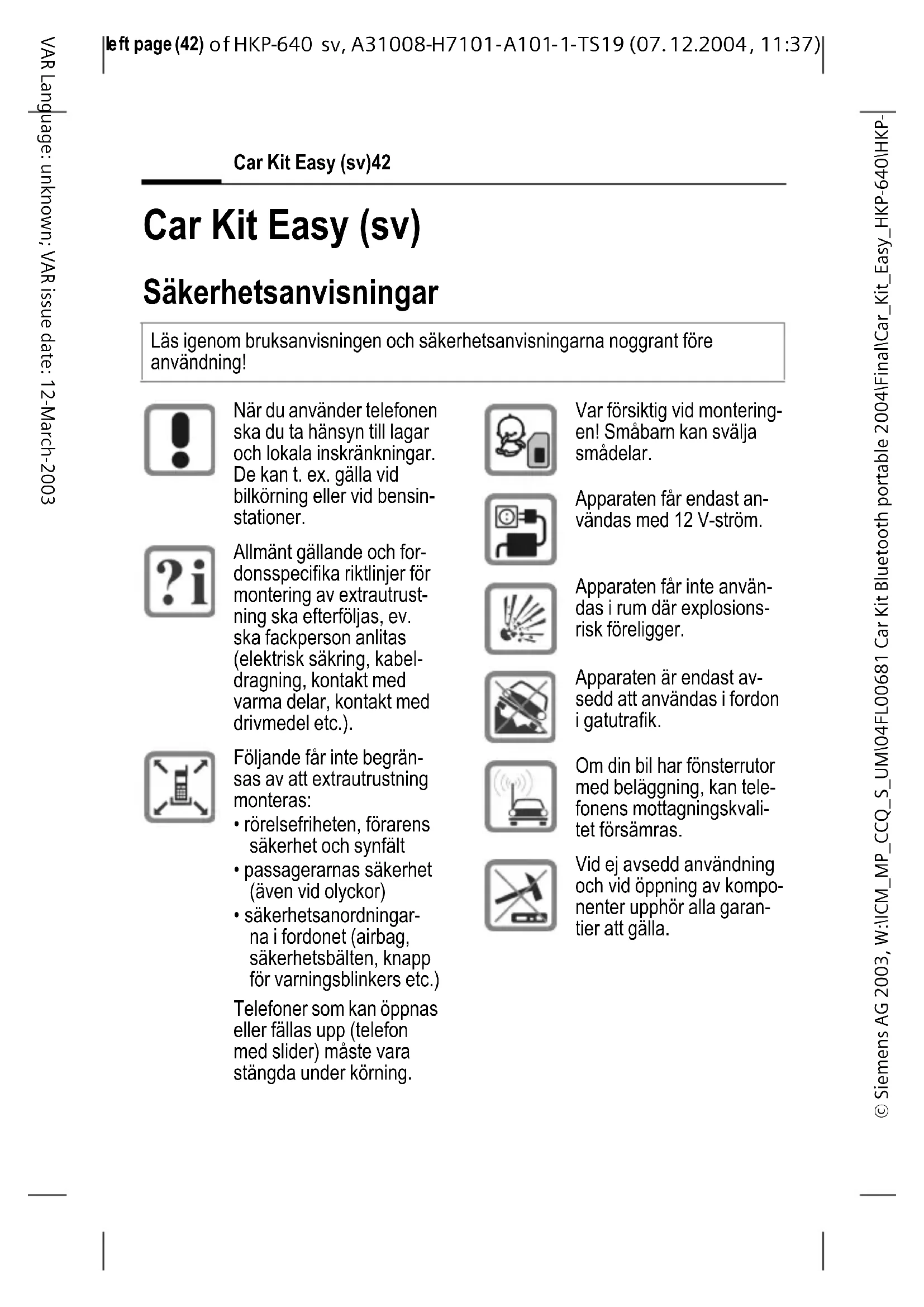 37) Car Kit Easy (sv)42 VAR Language: unknown; VAR issue date: 12-March-2003 Car Kit Easy (sv) Säkerhetsanvisningar Läs igenom bruksanvisningen och säkerhetsanvisningarna noggrant före användning! När du använder telefonen ska du ta hänsyn till lagar och lokala inskränkningar. De kan t. ex. gälla vid bilkörning eller vid bensin- stationer. Allmänt gällande och for- donsspecifika riktlinjer för montering av extrautrust- ning ska efterföljas, ev. ska fackperson anlitas (elektrisk säkring, kabel- dragning, kontakt med varma delar, kontakt med drivmedel etc.). Följande får inte begrän- sas av att extrautrustning monteras: