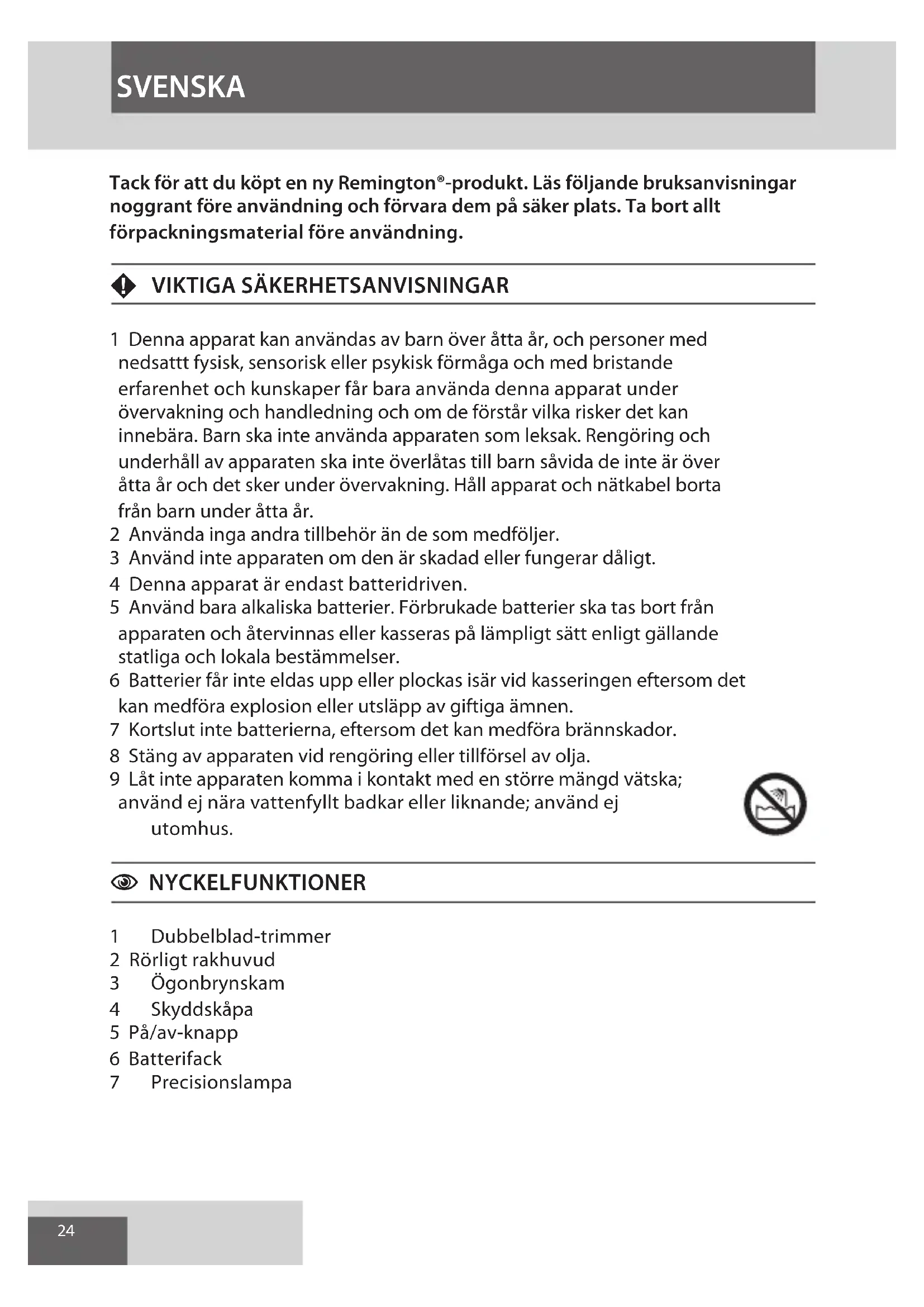 1 Denna apparat kan användas av barn över åtta år, och personer med nedsattt fysisk, sensorisk eller psykisk förmåga och med bristande erfarenhet och kunskaper får bara använda denna apparat under övervakning och handledning och om de förstår vilka risker det kan innebära. Barn ska inte använda apparaten som leksak. Rengöring och underhåll av apparaten ska inte överlåtas till barn såvida de inte är över åtta år och det sker under övervakning. Håll apparat och nätkabel borta från barn under åtta år. 2 Använda inga andra tillbehör än de som medföljer. 3 Använd inte apparaten om den är skadad eller fungerar dåligt. 4 Denna apparat är endast batteridriven. 5 Använd bara alkaliska batterier. Förbrukade batterier ska tas bort från apparaten och återvinnas eller kasseras på lämpligt sätt enligt gällande statliga och lokala bestämmelser. 6 Batterier får inte eldas upp eller plockas isär vid kasseringen eftersom det kan medföra explosion eller utsläpp av giftiga ämnen. 7 Kortslut inte batterierna, eftersom det kan medföra brännskador. 8 Stäng av apparaten vid rengöring eller tillförsel av olja. 9 Låt inte apparaten komma i kontakt med en större mängd vätska; använd ej nära vattenfyllt badkar eller liknande; använd ej utomhus. C NYCKELFUNKTIONER 1 Dubbelblad-trimmer 2 Rörligt rakhuvud 3 Ögonbrynskam 4 Skyddskåpa 5 På/av-knapp 6 Batterifack 7 Precisionslampa SVENSKA25