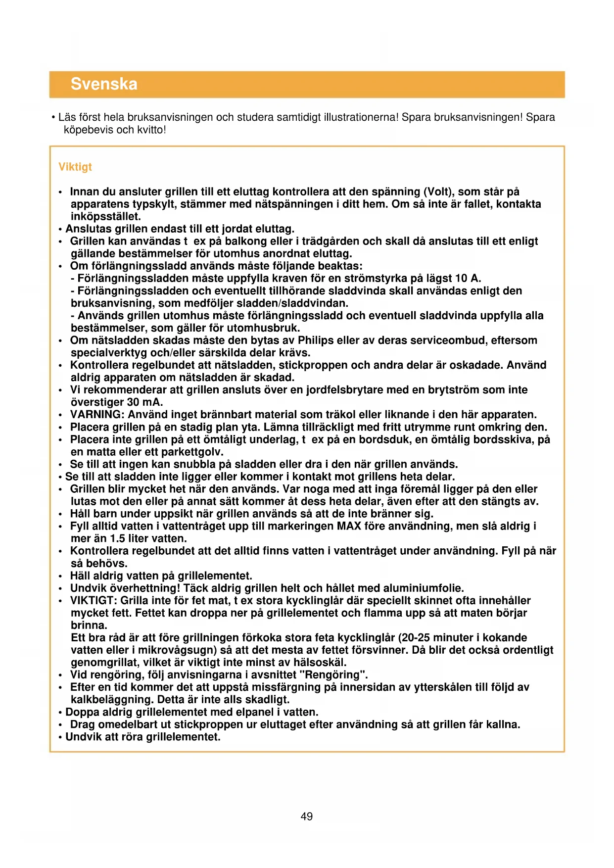 - VIKTIGT: Grilla inte för fet mat, t ex stora kycklinglår där speciellt skinnet ofta innehåller mycket fett. Fettet kan droppa ner på grillelementet och flamma upp så att maten börjar brinna. Ett bra råd är att före grillningen förkoka stora feta kycklinglår (20-25 minuter i kokande vatten eller i mikrovågsugn) så att det mesta av fettet försvinner. Då blir det också ordentligt genomgrillat, vilket är viktigt inte minst av hälsoskäl.