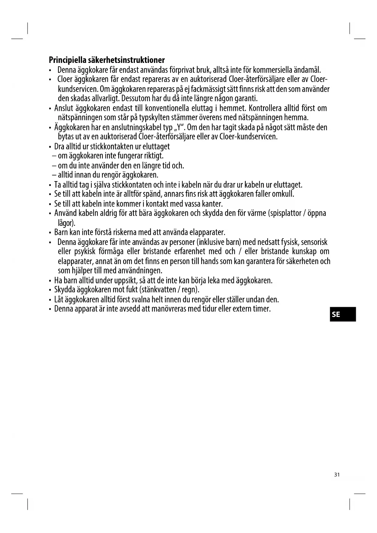 - Cloer aggkokaren fär endast repareras av en auktoriserad Cloer-aterforsäljare erler av Cloerkundservicen. Om aggkokaren repareras på ej facmässigt satt finns risk att den som anvander den skadas allvarligt. Dessutom har du dà inte langre nagoon garanti.