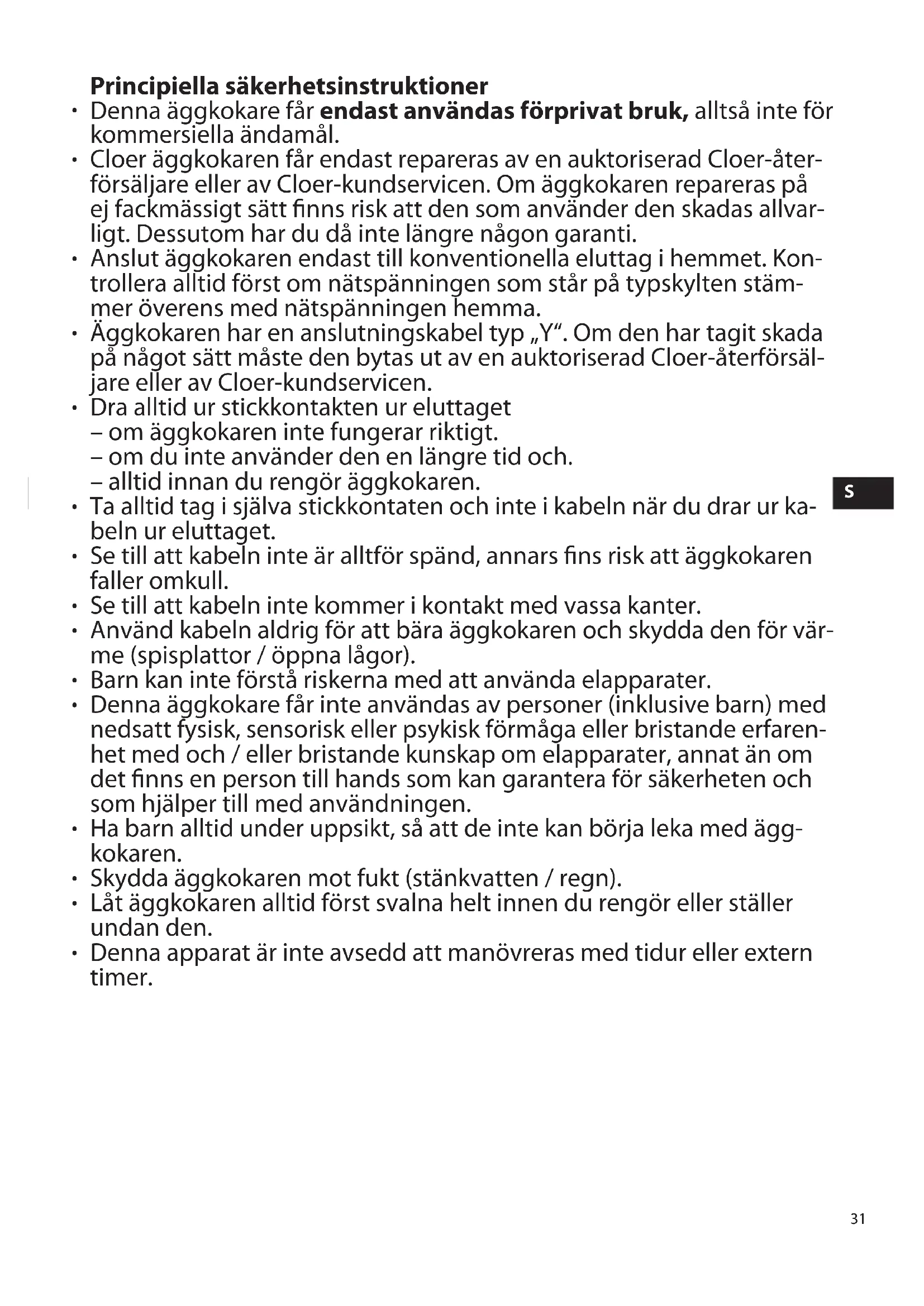 - 31 Principiella säkerhetsinstruktioner Denna äggkokare får endast användas förprivat bruk, alltså inte för kommersiella ändamål. Cloer äggkokaren får endast repareras av en auktoriserad Cloer-åter- försäljare eller av Cloer-kundservicen. Om äggkokaren repareras på ej fackmässigt sätt nns risk att den som använder den skadas allvar- ligt. Dessutom har du då inte längre någon garanti. Anslut äggkokaren endast till konventionella eluttag i hemmet. Kon- trollera alltid först om nätspänningen som står på typskylten stäm- mer överens med nätspänningen hemma. Äggkokaren har en anslutningskabel typ „Y“. Om den har tagit skada på något sätt måste den bytas ut av en auktoriserad Cloer-återförsäl- jare eller av Cloer-kundservicen. Dra alltid ur stickkontakten ur eluttaget – om äggkokaren inte fungerar riktigt. – om du inte använder den en längre tid och. – alltid innan du rengör äggkokaren. Ta alltid tag i själva stickkontaten och inte i kabeln när du drar ur ka- beln ur eluttaget. Se till att kabeln inte är alltför spänd, annars ns risk att äggkokaren faller omkull. Se till att kabeln inte kommer i kontakt med vassa kanter. Använd kabeln aldrig för att bära äggkokaren och skydda den för vär- me (spisplattor / öppna lågor). Barn kan inte förstå riskerna med att använda elapparater. Denna äggkokare får inte användas av personer (inklusive barn) med nedsatt fysisk, sensorisk eller psykisk förmåga eller bristande erfaren- het med och / eller bristande kunskap om elapparater, annat än om det nns en person till hands som kan garantera för säkerheten och som hjälper till med användningen. Ha barn alltid under uppsikt, så att de inte kan börja leka med ägg- kokaren. Skydda äggkokaren mot fukt (stänkvatten / regn). Låt äggkokaren alltid först svalna helt innen du rengör eller ställer undan den. Denna apparat är inte avsedd att manövreras med tidur eller extern timer.