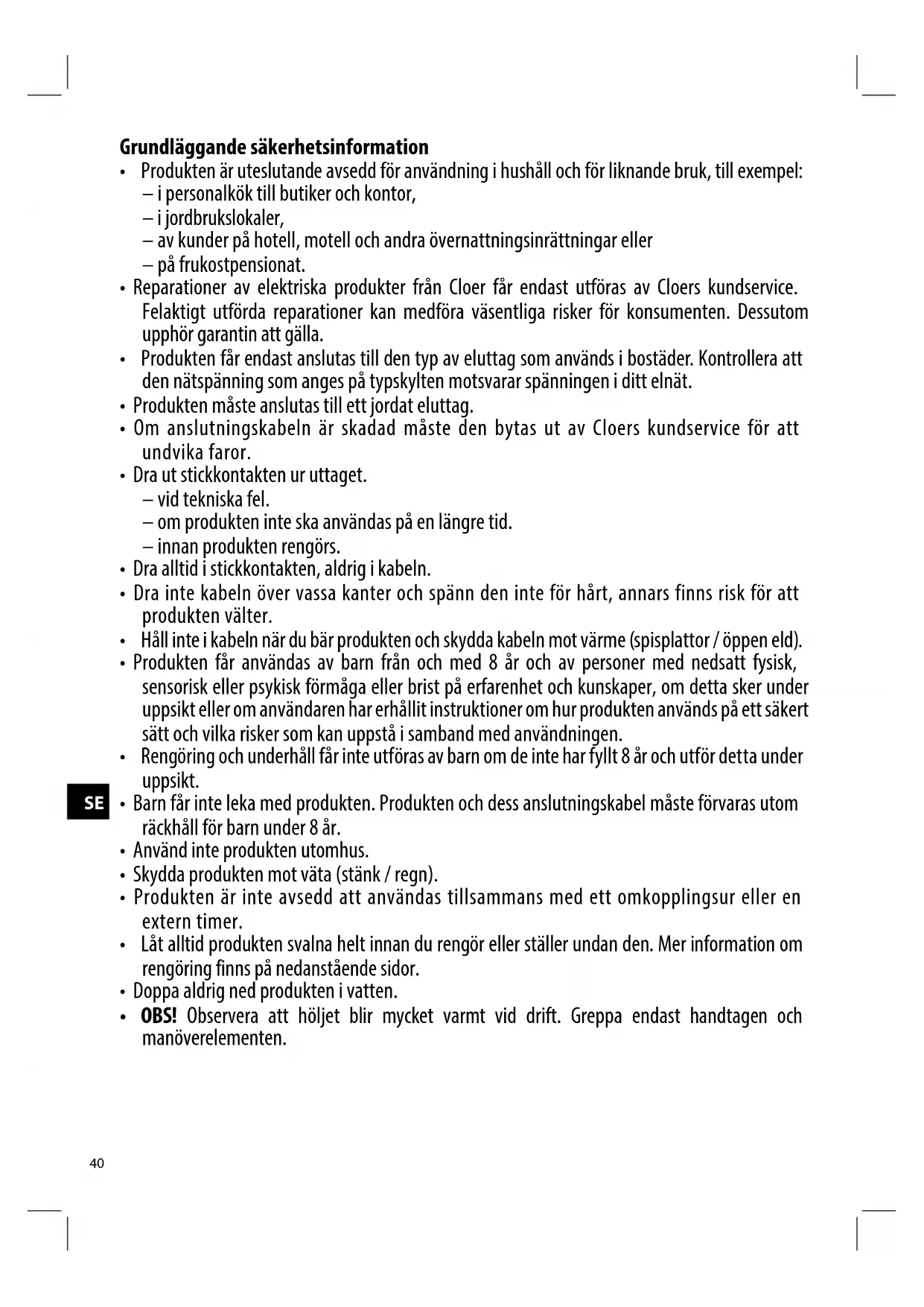 - Om anslutningskabeln är skadad måste den bytas ut av Cloers kundservice för att undvika faror.