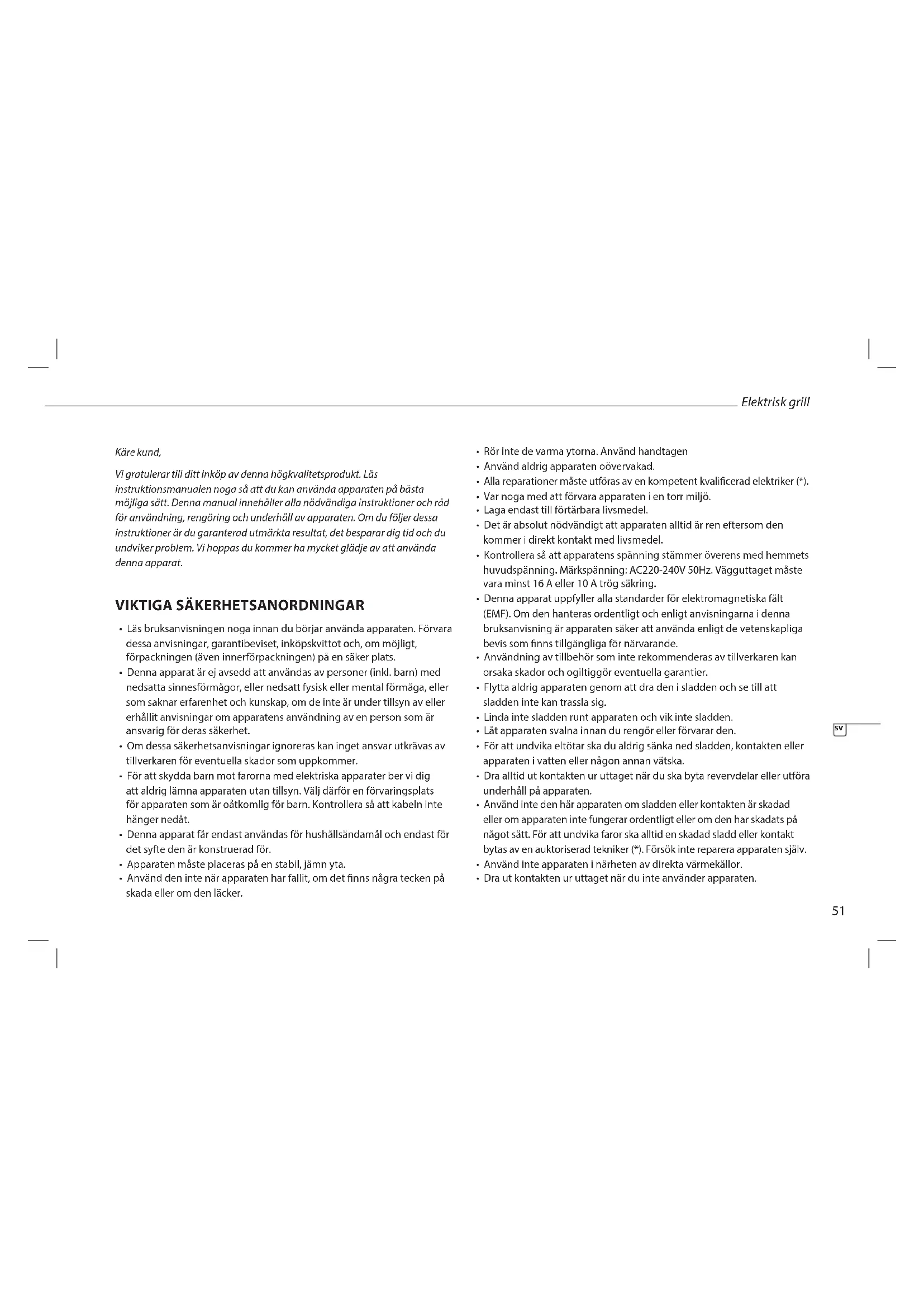 - Använd inte under några omständigheter kol eller annat fast eller ytande bränsle för att elda i grillen. (*) Kompetent kvalicerad elektriker: tillverkarens eller importörens kundtjänst eller en kvalicerad, godkänd och kompetent person som kan utföra den här typen av reparationer utan att utsätta sig själv eller andra för faror. Lämna alltid in apparaten till den elektrikern.