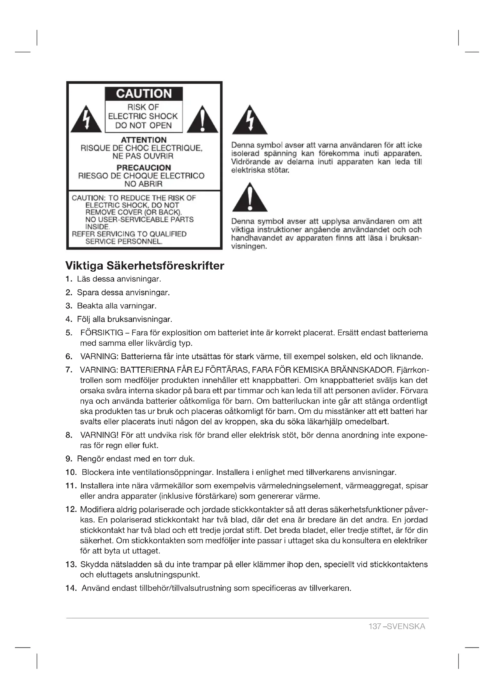 VARNING: BATTERIERNA FÅR EJ FÖRTÄRAS, FARA FÖR KEMISKA BRÄNNSKADOR. Fjärrkon- trollen som medföljer produkten innehåller ett knappbatteri. Om knappbatteriet sväljs kan det orsaka svåra interna skador på bara ett par timmar och kan leda till att personen avlider. Förvara nya och använda batterier oåtkomliga för barn. Om batteriluckan inte går att stänga ordentligt ska produkten tas ur bruk och placeras oåtkomligt för barn. Om du misstänker att ett batteri har svalts eller placerats inuti någon del av kroppen, ska du söka läkarhjälp omedelbart.