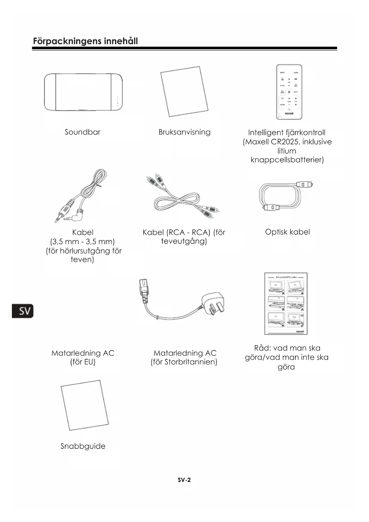 Stäng av soundbaren om den inte används under långvariga perioder och dra ur nätkontakten. Iakttagande av dessa säkerhetsnormer är viktigt för att undvika elektriska stötar eller fysiska skador.Viktiga säkerhetsdirektiv SV-5 Säkerhet 1 Läs den här bruksanvisningen. 2 Bevara den här bruksanvisningen. 3 Ta alla varningar i beaktande. 4 Följ instruktionerna. 5 Den här produkten får bara användas inomhus. 6 Rengör bara apparaten med en torr duk. 7 Skydda strömkabeln så att du inte kan gå på den eller krossa den. 8 Använd bara fästanordningar/tillbehör rekommenderade av tillverkaren. 9 Använd bara med en vagn, en hållare eller ett bord som tillverkaren har rekommenderat eller godkänt. Om du använder en vagn, var uppmärksam när den flyttas för att undvika skador genom att apparaten välter. 10 FÖRSÖK INTE ATT UTFÖRA UNDERHÅLLSÅTGÄRDER PÅ APPARATEN. Soundbaren får inte lämnas för underhåll efter att ha skadats, oavsett skadans form (skada på elkabeln eller på nätkontakten, utspilld vätska eller främmande föremål som har trängt in på insidan, exponering för regn eller fuktighet, funktionsstörning, fall av apparaten). 11 Den här apparaten är en soundbar i kategori II utan isolering eller jordskydd. 12 Nätkontakten CA representerar huvudströmbrytaren. Stickproppen måste alltid vara lättillgänglig. 13 VARNING: om du tillåter barnen att skjuta, dra eller klättra upp på en teve ansluten till apparaten kan den sistnämnda ramla ned och orsaka svåra eller dödliga skador. För högsta säkerhet och stabilitet se till att teven är utrustad med ett tippskydd.Identifikation av delarna SV-6 vy ovanifrån