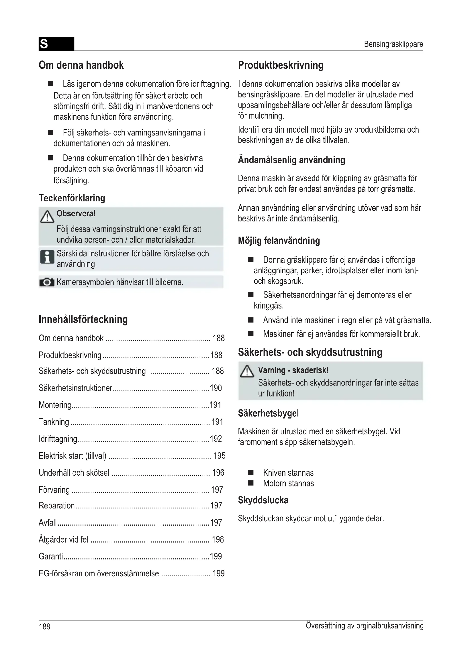 - Bensingräsklippare Innehållsförteckning Om denna handbok p. 188