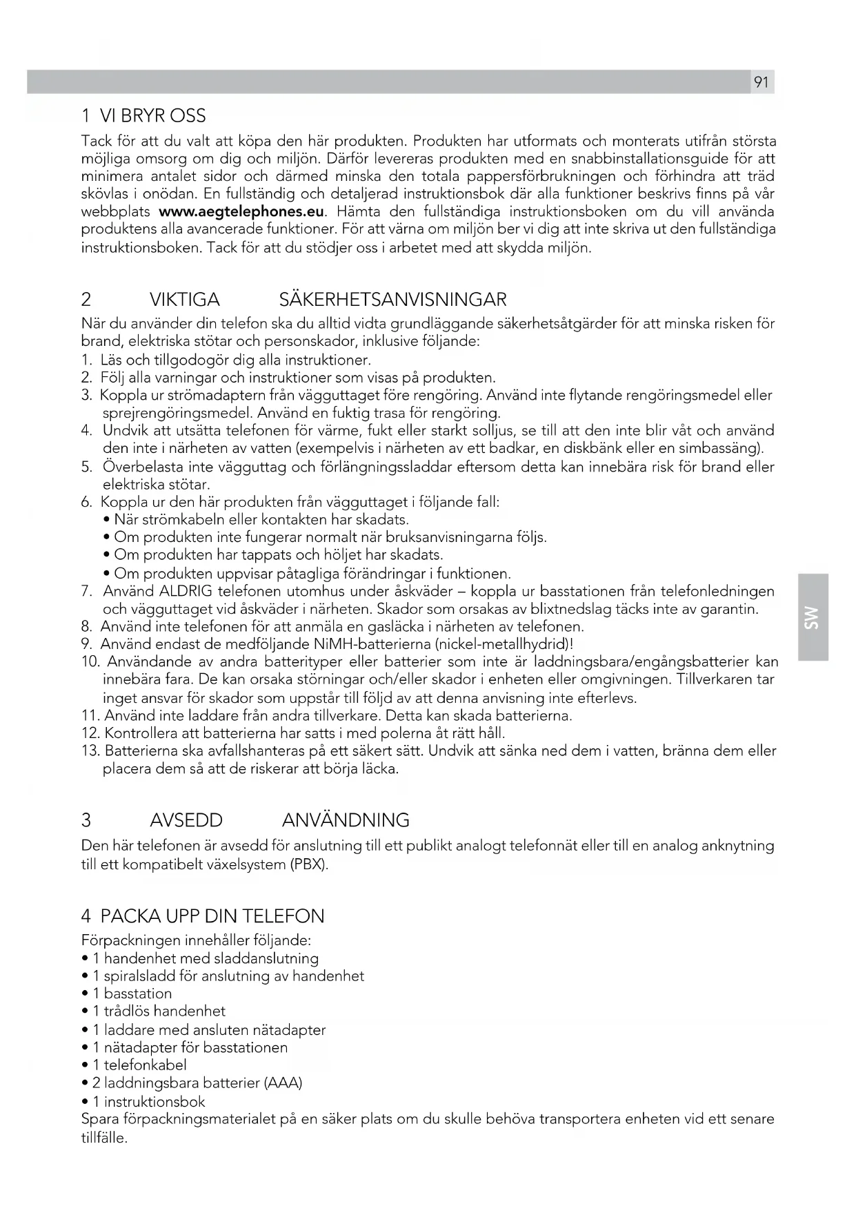 Tack för att du valt att köpa den här produkten. Produkten har utformats och monterats utifrån största möjliga omsorg om dig och miljön. Därför levereras produkten med en snabbinstallationsguide för att minimera antalet sidor och därmed minska den totala pappersförbrukningen och förhindra att träd skövlas i onödan. En fullständig och detaljerad instruktionsbok där alla funktioner beskrivs finns på vår webbplats www.aegtelephones.eu. Hämta den fullständiga instruktionsboken om du vill använda produktens alla avancerade funktioner. För att värna om miljön ber vi dig att inte skriva ut den fullständiga instruktionsboken. Tack för att du stödjer oss i arbetet med att skydda miljön.