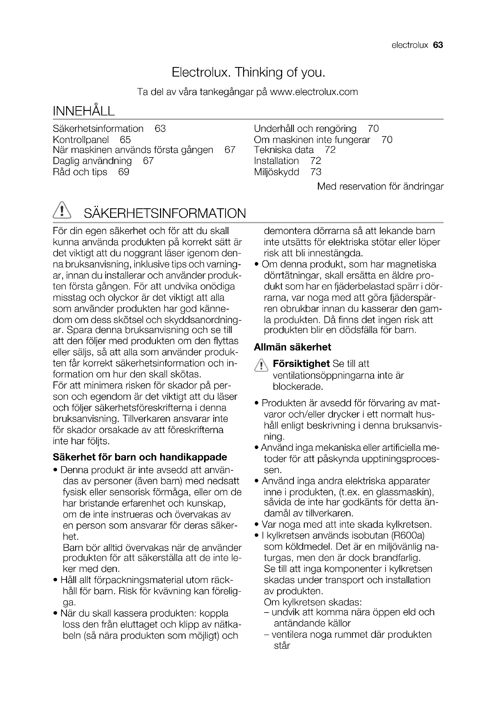 O símbolo no produto ou na embalagem indica que este produto não pode ser tratado como lixo doméstico. Em vez disso, deve ser entregue ao centro de recolha selectiva para a reciclagem de equipamento eléctrico e electrónico. Ao garantir uma eliminação adequada deste produto, irá ajudar a evitar eventuais consequências negativas para o meio ambiente e para a saúde pública, que, de outra forma, poderiam ser provocadas por um tratamento incorrecto do produto. Para obter informações mais pormenorizadas sobre a reciclagem deste produto, contacte os serviços municipalizados locais, o centro de recolha selectiva da sua área de residência ou o estabelecimento onde adquiriu o produto. 62 electroluxElectrolux. Thinking of you. Ta del av våra tankegångar på www.electrolux.com INNEHÅLL Säkerhetsinformation 63 Kontrollpanel 65 När maskinen används första gången 67 Daglig användning 67 Råd och tips 69 Underhåll och rengöring 70 Om maskinen inte fungerar 70 Tekniska data 72 Installation 72 Miljöskydd 73 Med reservation för ändringar SÄKERHETSINFORMATION För din egen säkerhet och för att du skall kunna använda produkten på korrekt sätt är det viktigt att du noggrant läser igenom den- na bruksanvisning, inklusive tips och varning- ar, innan du installerar och använder produk- ten första gången. För att undvika onödiga misstag och olyckor är det viktigt att alla som använder produkten har god känne- dom om dess skötsel och skyddsanordning- ar. Spara denna bruksanvisning och se till att den följer med produkten om den flyttas eller säljs, så att alla som använder produk- ten får korrekt säkerhetsinformation och in- formation om hur den skall skötas. För att minimera risken för skador på per- son och egendom är det viktigt att du läser och följer säkerhetsföreskrifterna i denna bruksanvisning. Tillverkaren ansvarar inte för skador orsakade av att föreskrifterna inte har följts. Säkerhet för barn och handikappade