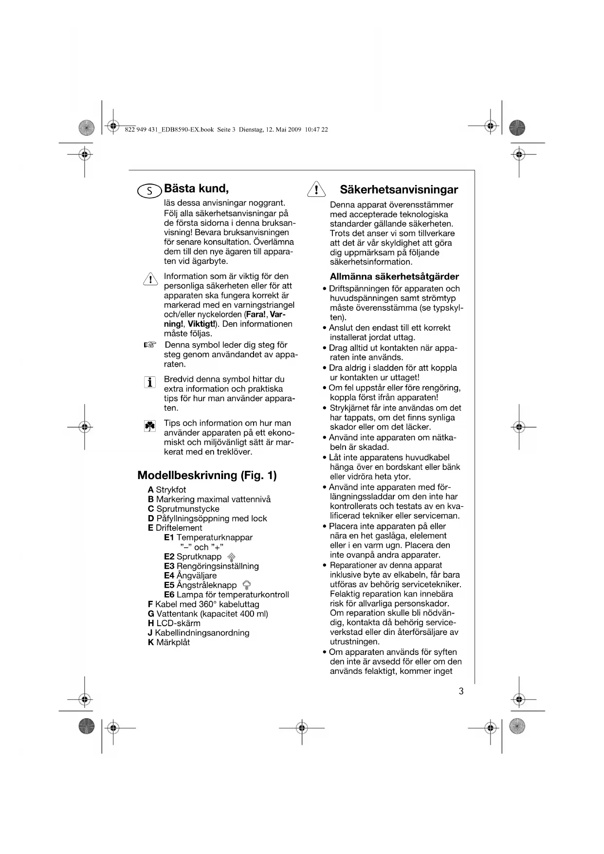 Tips och information om hur man använder apparaten på ett ekono-miskt och miljövänligt sätt är mar-kerat med en treklöver. Modellbeskrivning (Fig. 1) A StrykfotB Markering maximal vattennivåC SprutmunstyckeD Påfyllningsöppning med lockE DriftelementE1 Temperaturknappar ”–” och ”+”E2 SprutknappE3 RengöringsinställningE4 ÅngväljareE5 ÅngstråleknappE6 Lampa för temperaturkontrollF Kabel med 360° kabeluttagG Vattentank (kapacitet 400 ml)H LCD-skärmJ KabellindningsanordningK Märkplåt 1 Säkerhetsanvisningar Denna apparat överensstämmer med accepterade teknologiska standarder gällande säkerheten. Trots det anser vi som tillverkare att det är vår skyldighet att göra dig uppmärksam på följande säkerhetsinformation. Allmänna säkerhetsåtgärder