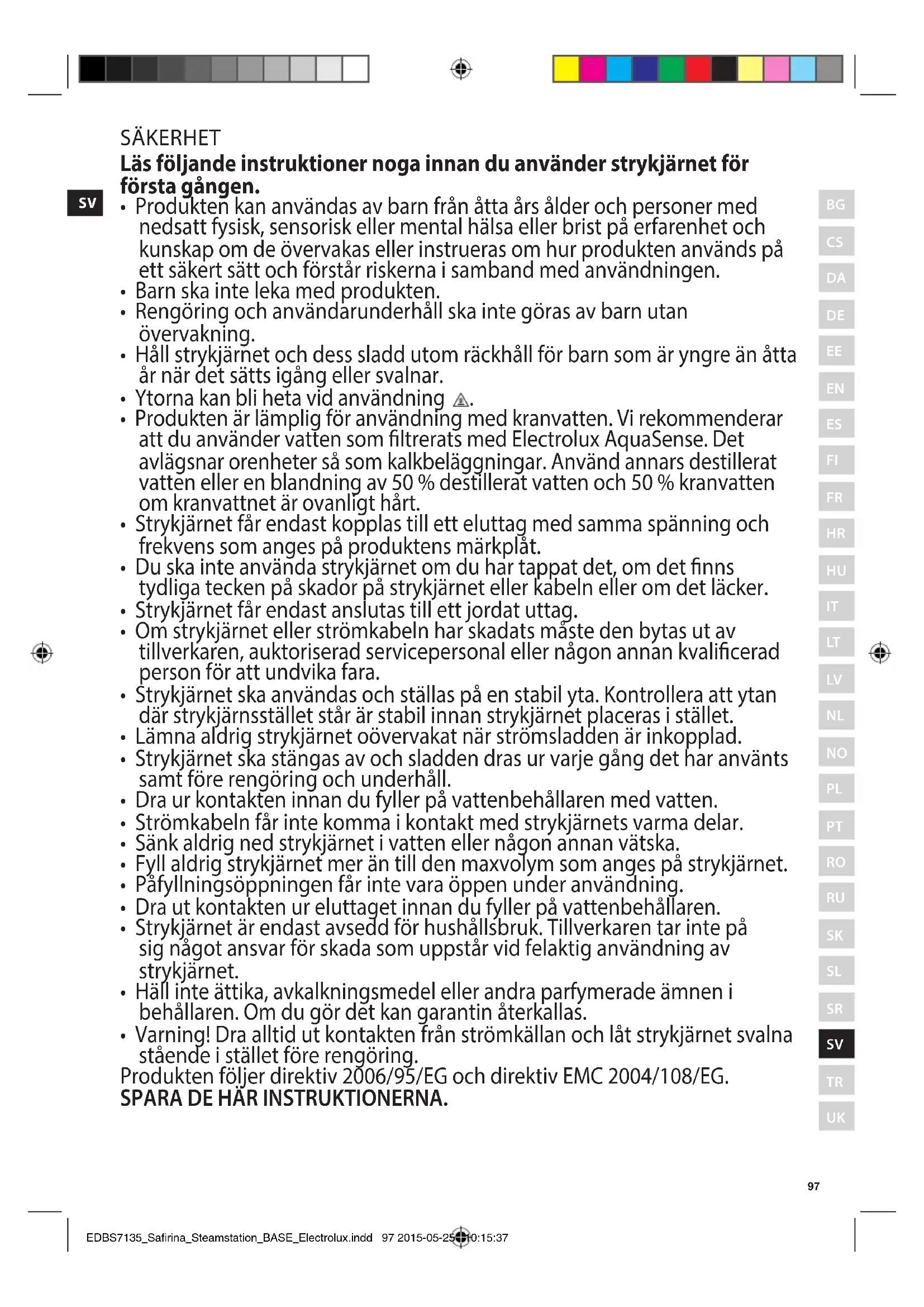 EDBS7135_Safirina_Steamstation_BASE_Electrolux.indd 96 2015-05-25 10:15:37SV SÄKERHET Läs följande instruktioner noga innan du använder strykjärnet för första gången.