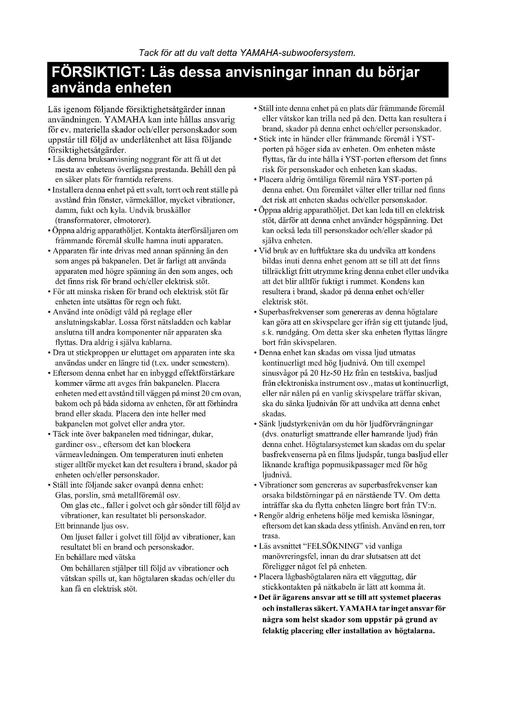 - Det är ägarens ansvar att se till att systemet placeras och installeras säkert. YAMAHA tar inget ansvar för några som helst skador som uppstår på grund av felaktig placering eller installation av högtalarna. FÖRSIKTIGT: Läs dessa anvisningar innan du börjar använda enheten1 Svenska
