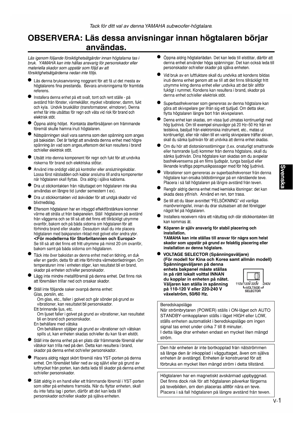 Die Theorie der Yamaha Active Servo Technology basiert auf zwei Grundfaktoren: dem Helmholtz-Resonator und der Negativimpedanzansteuerung. Active Servo Processing- Lautsprecher reproduzieren die Baßfrequenzen durch eine Baßöffnung in der Lautsprecherbox. Diese Öffnung übernimmt die Funktion eines Tieftonlautsprechers in herkömmlichen Lautsprechersystemen und wird an dessen Stelle verwendet. Laut der Helmholtztheorie können im Bereich der Resonanzfrequenz durch kleine Erregerschwingungen große Ausgangsamplituden erzeugt werden. Die Resonanzfrequenz der Box wird daher so dimensioniert, daß sie in dem Bereich liegt, wo der Wiedergabepegel des Tieftöners absinkt. Dadurch wird der lineare Wiedergabefrequenzbereich bis zu sehr tiefen Tönen erweitert. Um Resonanzüberhöhungen und unpräzise Baßwiedergabe zu vermeiden sind große Antriebs- und Rückstellkräfte der Lautsprechermembran nötig. Zur Lösung dieses Problems wurde von den YAMAHA- Konstrukteuren ein Verstärkerprinzip entwickelt, das folgende Theorie verwirklicht: Wird der elektrische Widerstand der Schwingspule auf Null reduziert, käme es in Bezug auf die Signalspannung zu einer linearen Bewegung der Lautsprechermembran. Um diese Reduzierung zu erreichen, wird ein spezieller Verstärker eingesetzt, dessen Ausgangsimpedanz genau der der Box, jedoch mit umgekehrtem Vorzeichen entspricht. Diese negative Ausgangsimpedanz ermöglicht die Erzeugung der nötigen Antriebskräfte wodurch hervorragende Tiefbaßwiedergabe und Dämpfungseigenschaften erreicht werden. Durch die Verwendung eines Verstärkers mit Negativimpedanz- Ansteuerung und der Lautsprecherbox mit Helmholtz- Resonator kann dieses System deshalb einen extrem weiten Frequenzbereich mit erstaunlicher Klangqualität und reduziertem Verzerrungsgrad reproduzieren. Die Kombination der oben beschriebenen Merkmale stellt die grundlegende Konfiguration der herkömmlichen Yamaha Active Servo Technology dar. Unsere neue Active Servo Technology — Advanced Yamaha Active Servo Technology — wendet fortschrittliche Negativ-Impedanz-Wandler (ANIC) Schaltungen an, die eine dem herkömmlichen Negativimpedanz-Wandler dynamische Variation erlauben, um einen optimalen Wert für Lautsprecherimpedanz-Variationen zu wählen. Mit den neuen ANIC-Schaltungen kann Advanced Yamaha Active Servo Technology stabilere Leistung und verbesserten Schalldruck im Vergleich mit herkömmlicher Yamaha Active Servo Technology erzeugen, wodurch eine natürliche und dynamische Tiefenwiedergabe erzielt wird. Bässe mit hoher Amplitude Lautsprecherbox Öffnung Luftlautsprecher (Helmholtz-Resonator) Verstärker mit Active Servo Processing Signale Signale geringer Amplitude Fortschrittlicher Negativimpedanz-Wandler 4-SW015(G)(03.2.28)a 03.2.28, 7:17 PM9D-10 FEHLERSUCHE Sehen Sie sich bei Funktionsstörungen dieses Gerätes die unten stehende Tabelle an. Wenn Ihr Problem unten nicht aufgelistet wird oder wenn die unten stehenden Anleitungen keine Abhilfe schaffen, trennen Sie bitte das Netzkabel ab und nehmen Sie Kontakt zu Ihrem autorisierten YAMAHA-Händler oder zu einem Kundendienst-Center auf. Störung Selbst bei gedrückter STANDBY/ ON-Taste (ON) keine Stromversorgung Keine Tonwiedergabe Zu geringer Tonwiedergabepegel Der Subwoofer wird nicht automatisch eingeschaltet. Der Subwoofer schaltet sich nicht automatisch in den Standby- Betrieb. Der Subwoofer wird unerwartet in die Betriebsbereitschaft ausgeschaltet. Der Subwoofer wird unerwartet eingeschaltet. Abhilfe Das Netzkabel richtig anschließen. Der Netzschalter (POWER) ist auf die Position ON gestellt. Den Lautstärkeregler (VOLUME) nach rechts drehen. Die Kabel richtig anschließen. Die Kabel seitenrichtig anschließen, so dass L (links) an L, R (rechts) an R, „+“ an „+“ und „-“ an „-“ angeschlossen ist. Den Schalter in die andere Position stellen. Eine Tonquelle mit Baßfrequenzen wiedergeben. Übergangsfrequenzregler (HIGH CUT) eine höhere Frequenz einstellen. Den Subwoofer anders positionieren oder die parallelen Wände durch Aufstellen von Büchergestellen usw. auflösen. Den Netzschalter (POWER) in die Position “ON” stellen. Die STANDBY/ON-Taste ist auf die Position ON gestellt. Den Ein/Aus-Schalter (AUTO STANDBY) in die Position “HIGH” oder “LOW” stellen. Den Ein/Aus-Schalter (AUTO STANDBY) in die Position “HIGH” stellen. Der Subwoofer weiter von der Störquelle entfernt aufstellen und/oder die Lautsprecherkabel anders verlegen. Oder stellen Sie den Ein/Aus-Schalter (AUTO STANDBY) in die Position “OFF”. Den Ein/Aus-Schalter (AUTO STANDBY) in die Position “HIGH” oder “LOW” stellen. Den Ein/Aus-Schalter (AUTO STANDBY) in die Position “HIGH” stellen. Der Subwoofer weiter von der Störquelle entfernt aufstellen und/oder die Lautsprecherkabel anders verlegen. Oder stellen Sie den Ein/Aus-Schalter (AUTO STANDBY) in die Position “OFF”. Ursache Der Netzstecker ist nicht richtig angeschlossen. Stellen Sie den Netzschalter (POWER) auf die Position OFF. Der Lautstärkeregler (VOLUME) ist auf “0” gestellt. Die Lautsprecherkabel sind nicht richtig angeschlossen. Die Lautsprecherkabel sind nicht richtig angeschlossen. Der Phasenschalter (PHASE) ist nicht richtig eingestellt. Die wiedergegebene Tonquelle hat keine tiefen Baßfrequenzen. Die Wiedergabe wird durch Stehwellen beeinflußt. Der Netzschalter (POWER) befindet sich in der Position “OFF”. Stellen Sie die STANDBY/ON-Taste auf die Position OFF. Der Ein/Aus-Schalter (AUTO STANDBY) befindet sich in der Position “OFF”. Pegel des Eingangssignals ist zu niedrig. Einwirkung von Störgeräuschen von externen Geräten. Der Ein/Aus-Schalter (AUTO STANDBY) befindet sich in der Position “OFF”. Pegel des Eingangssignals ist zu niedrig. Einwirkung von Störgeräuschen von externen Geräten. 4-SW015(G)(03.2.28)a 03.2.28, 7:17 PM10Svenska V-1 OBSERVERA: Läs dessa anvisningar innan högtalaren börjar användas. Läs igenom följande försiktighetså