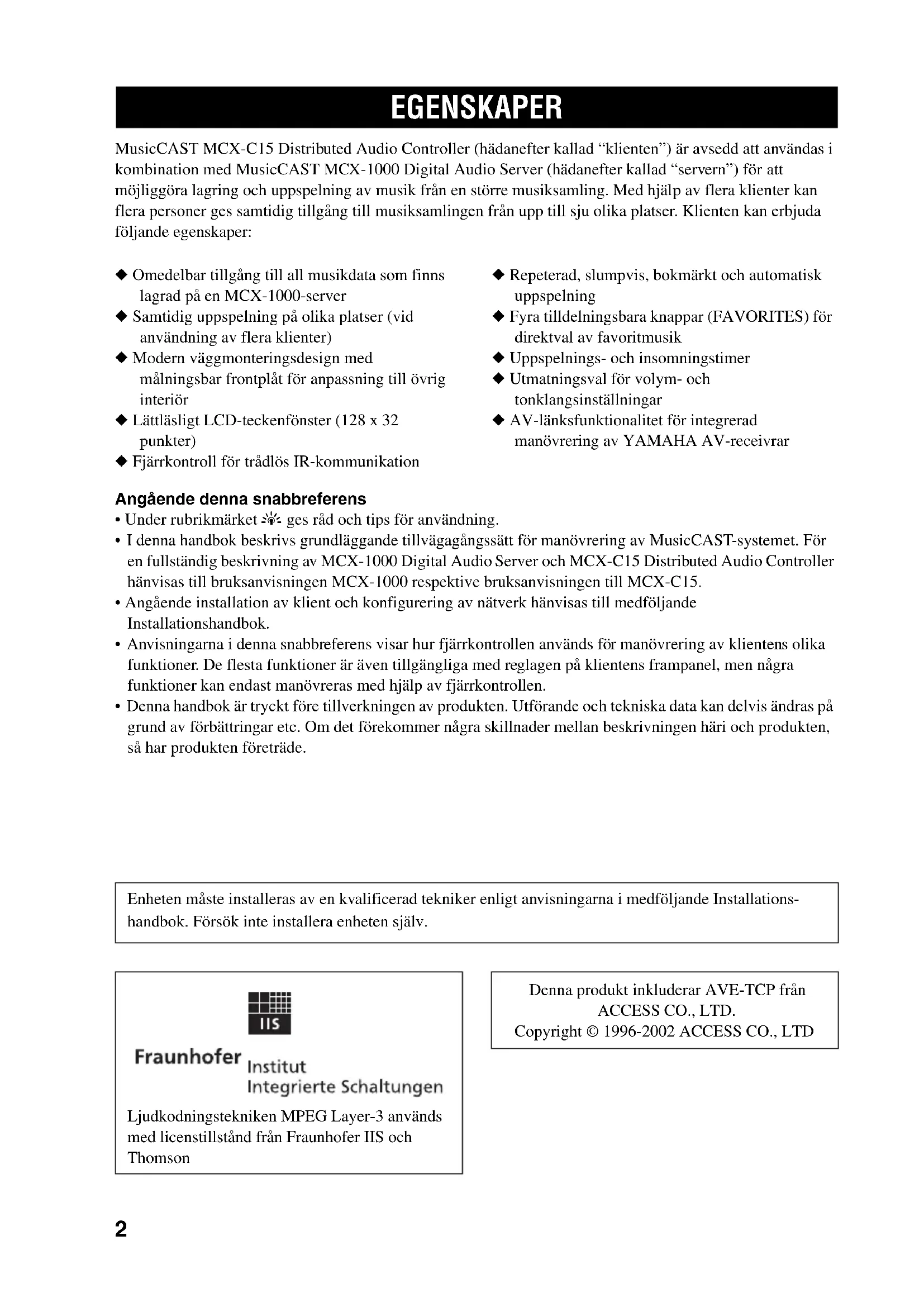 - Denna handbok är tryckt före tillverkningen av produkten. Utförande och tekniska data kan delvis ändras på grund av förbättringar etc. Om det förekommer några skillnader mellan beskrivningen häri och produkten, så har produkten företräde. EGENSKAPER Enheten måste installeras av en kvalificerad tekniker enligt anvisningarna i medföljande Installations- handbok. Försök inte installera enheten själv. Ljudkodningstekniken MPEG Layer-3 används med licenstillstånd från Fraunhofer IIS och Thomson Denna produkt inkluderar AVE-TCP från ACCESS CO., LTD. Copyright © 1996-2002 ACCESS CO., LTD3 Svenska INLEDNING Med de olika konfigureringsmöjligheter som erbjuds genom användning av ett lokalt nätverk (LAN) kan MusicCAST-systemet användas till att låta flera familjemedlemmar lagra sina egna musiksamlingar i en central enhet för uppspelning och återgivning på olika platser i hemmet. Efter att musikdata har lagrats är det möjligt att skapa spellistor, bokmärka melodier och registrera favoritmusik för omedelbar åtkomst genom en enkel knapptryckning. Det avancerade MusicCAST-systemet består av en server och dess anslutna klienter. Dessutom kan förstärkaren MCX-CA15 (tillval) anslutas för drift av högtalare och externa komponenter.