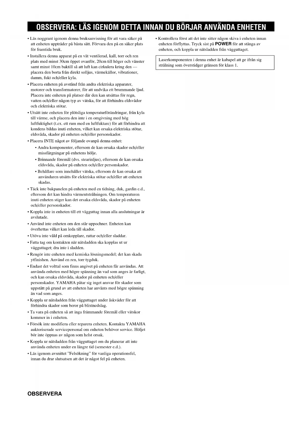 - Försök inte modifiera eller reparera enheten. Kontakta YAMAHA auktoriserade servicepersonal om enheten behöver service. Höljet bör inte öppnas av någon som helst orsak.