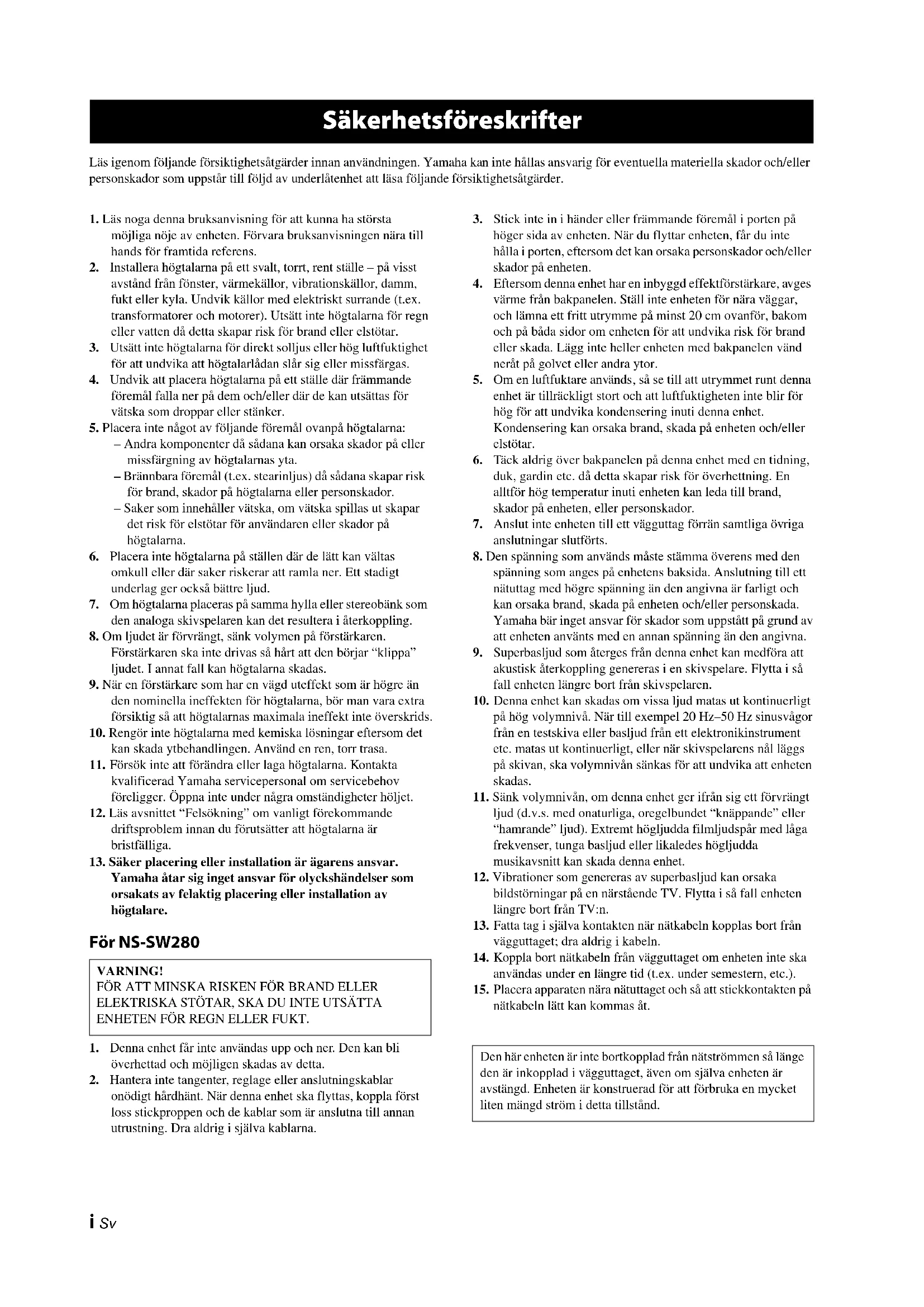 Yamaha åtar sig inget ansvar för olyckshändelser som orsakats av felaktig placering eller installation av högtalare. För NS-SW280