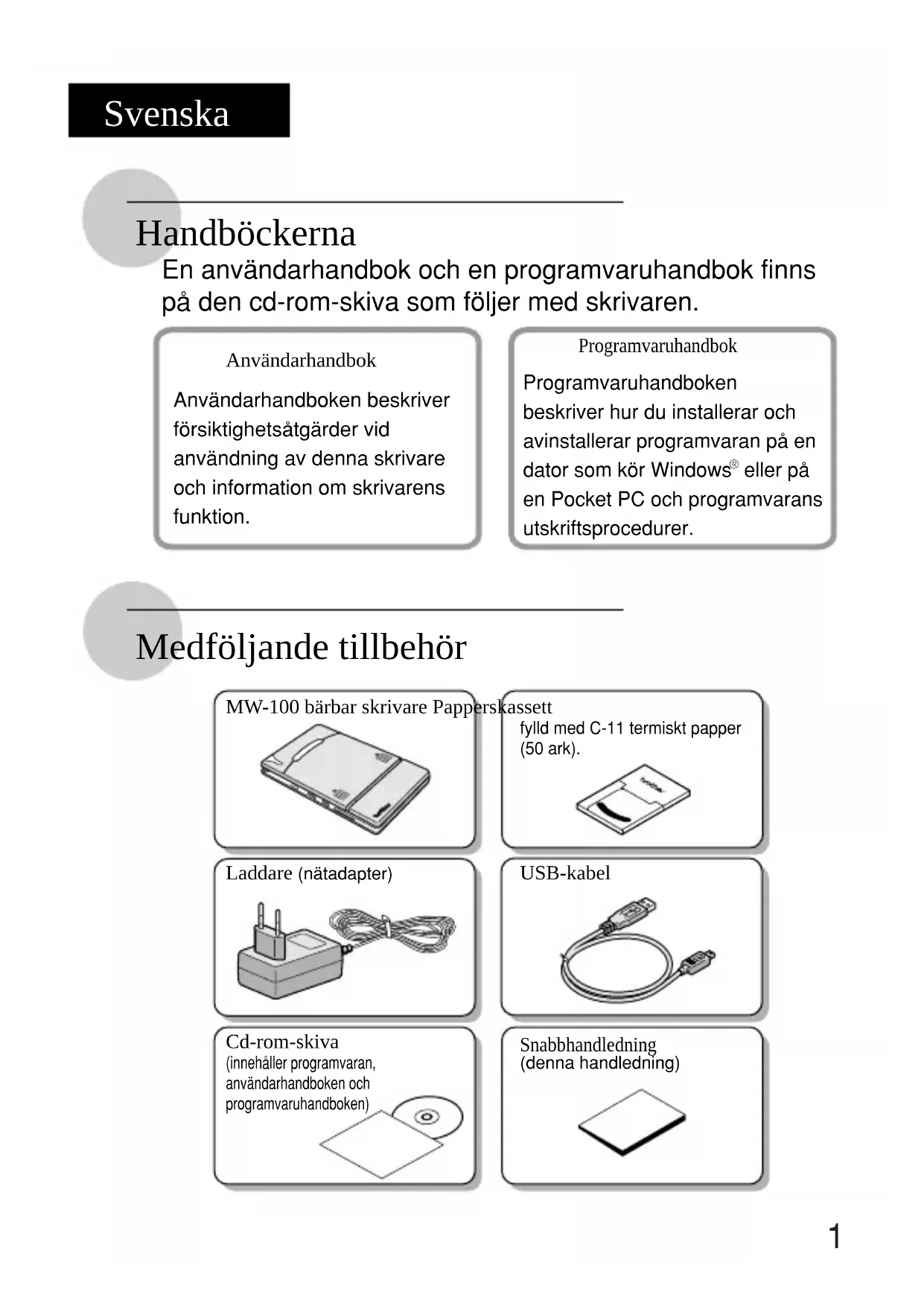 eller på en Pocket PC och programvarans utskriftsprocedurer. MW-100 bärbar skrivare Papperskassett fylld med C-11 termiskt papper (50 ark). Laddare (nätadapter) Cd-rom-skiva (innehåller programvaran, användarhandboken och programvaruhandboken) Snabbhandledning (denna handledning) USB-kabel Svenska 1Skrivarens användning Läs snabbhandledningen och kontrollera att alla tillbehör finns med. Sätt in bifogad cd-rom-skiva i cd-rom-enheten på datorn med Windows